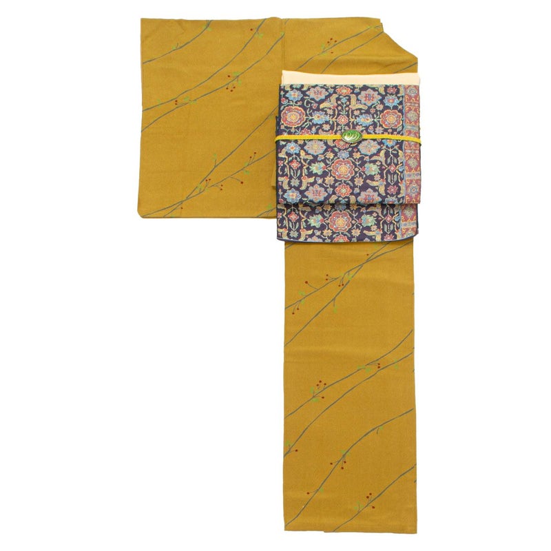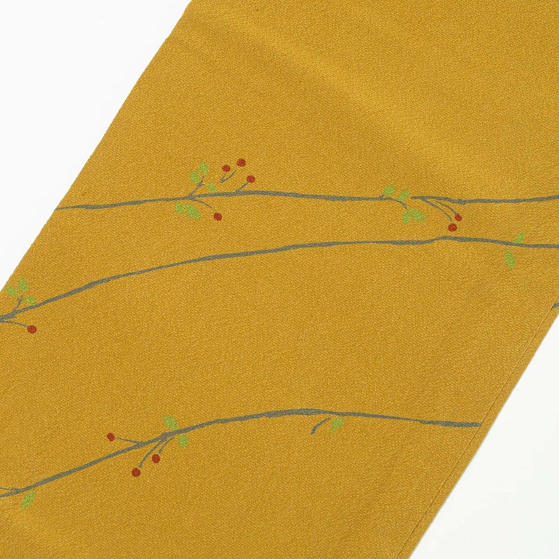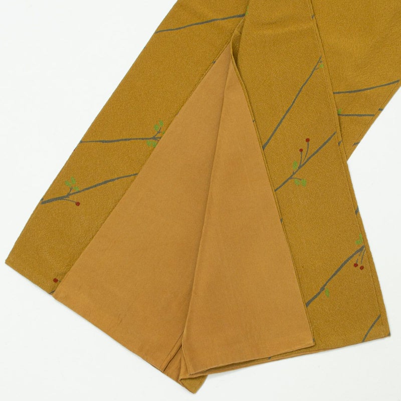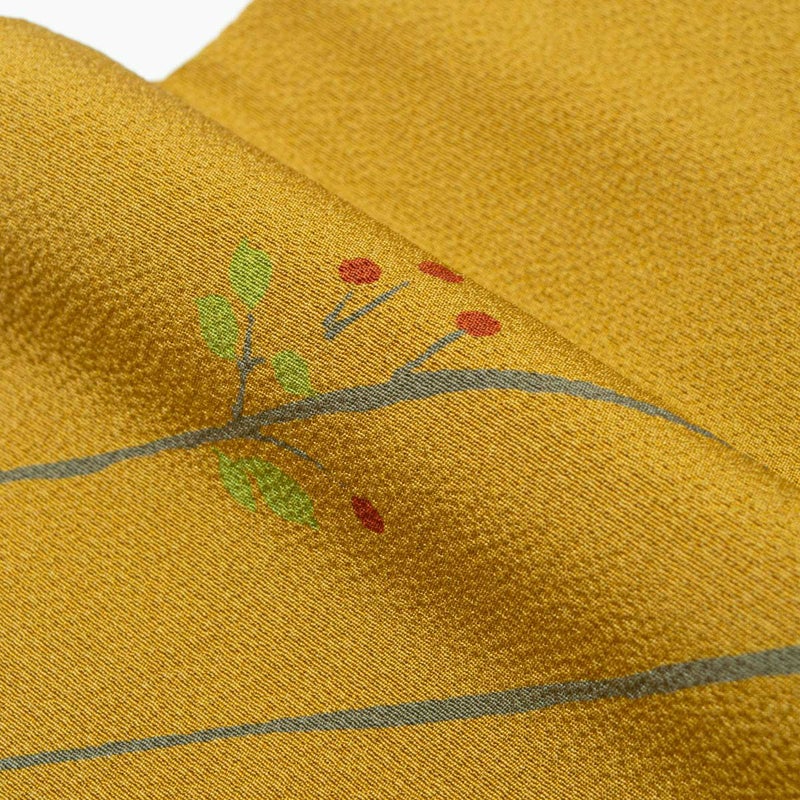 山吹茶色に染め上げた地に、枝と樹の実を軽やかに描いた小紋です。