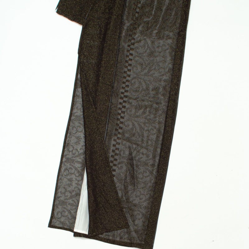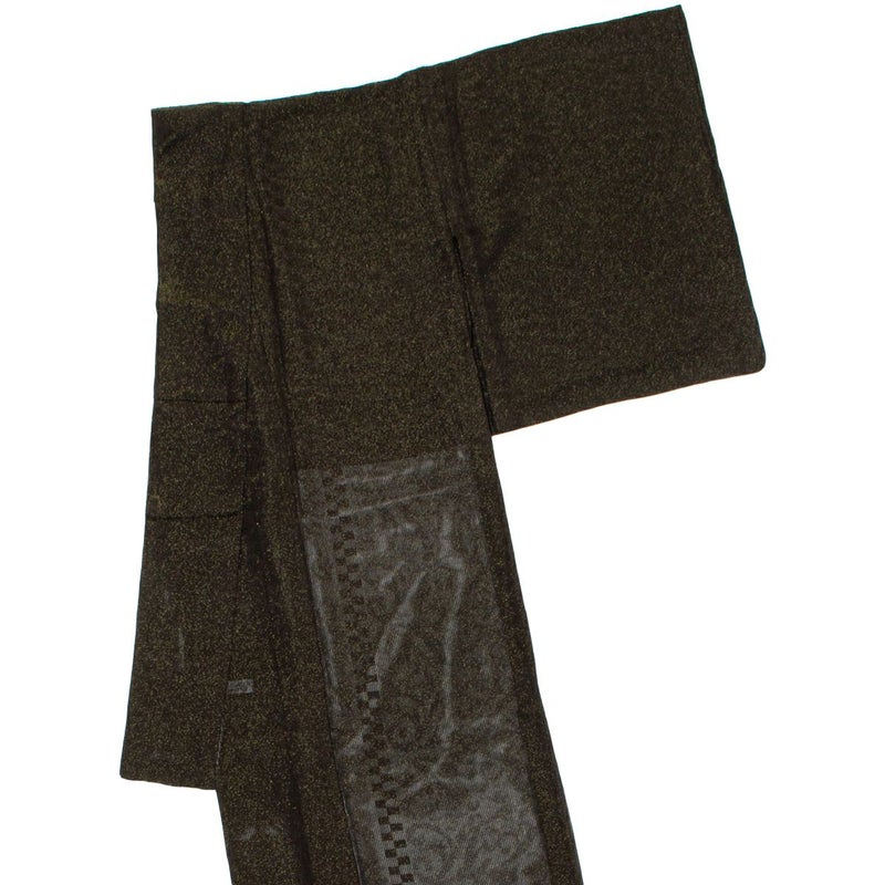 黒と金色の糸で織られ市松模様がスタイリッシュな印象を与える、最近ではほとんど見なくなった貴重な絽縮緬の小紋です。