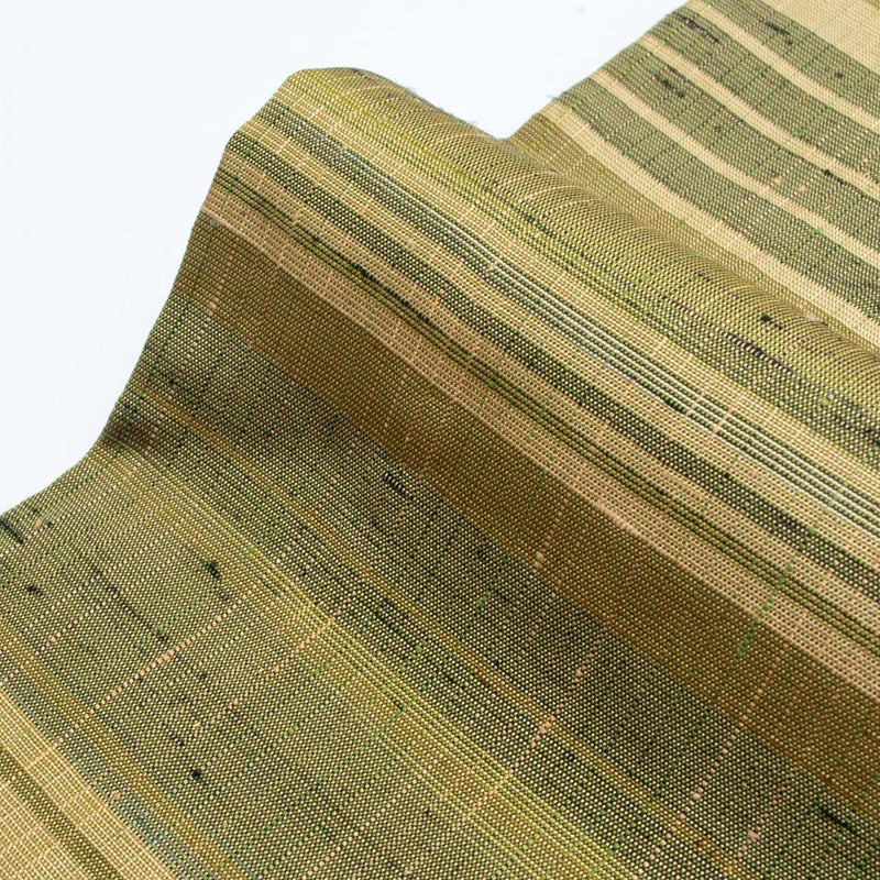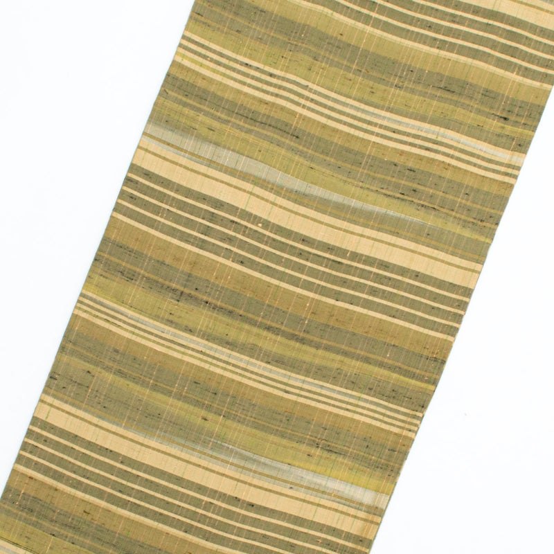ベージュを基調に黒・緑・青色糸を配したマルチカラーの横段が印象的で、落ち着きの中に軽やかなリズムを生みます。