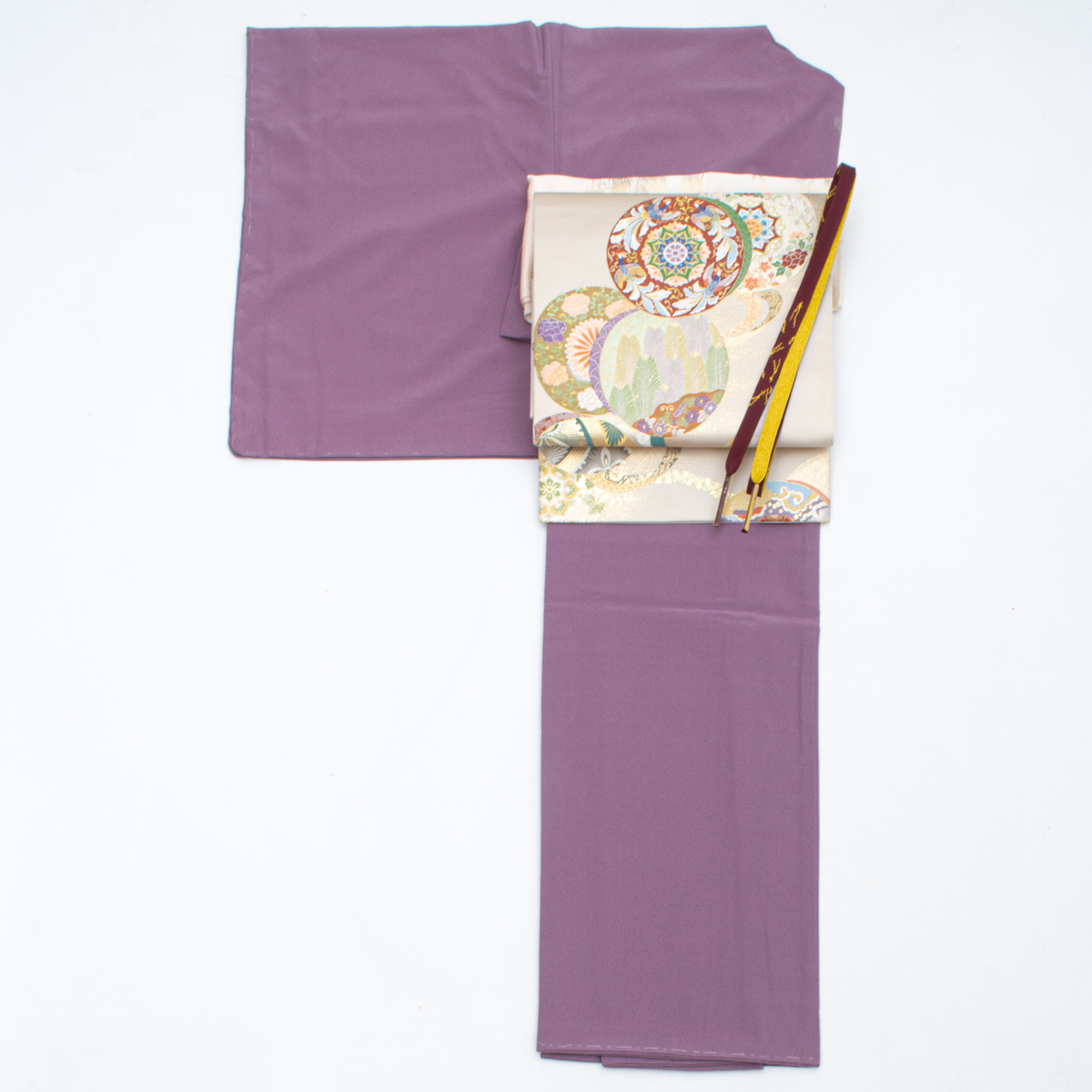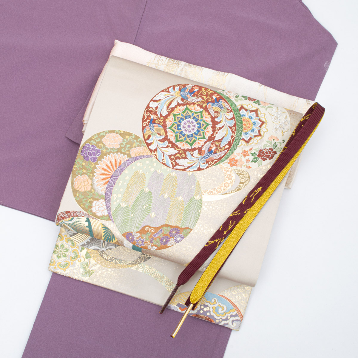 ■コメント色無地 一つ紋 藤色と袋帯 丸に有職文様と植物柄 オフホワイト マルチカラーのコーディネートです。