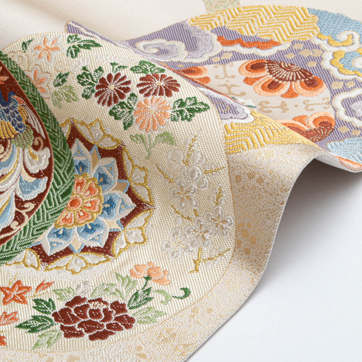 オフホワイトの地にマルチカラーがやさしく映え、華やかさと気品を兼ね備えています。