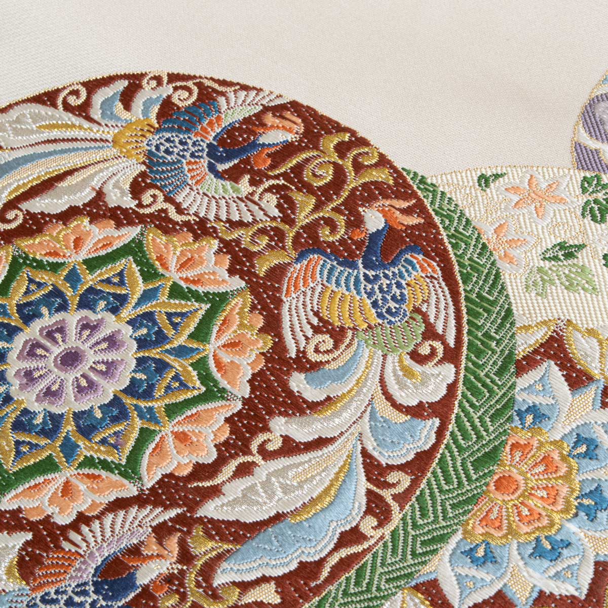 合わせた袋帯は、丸に有職文様と植物柄を配した格調高い意匠。