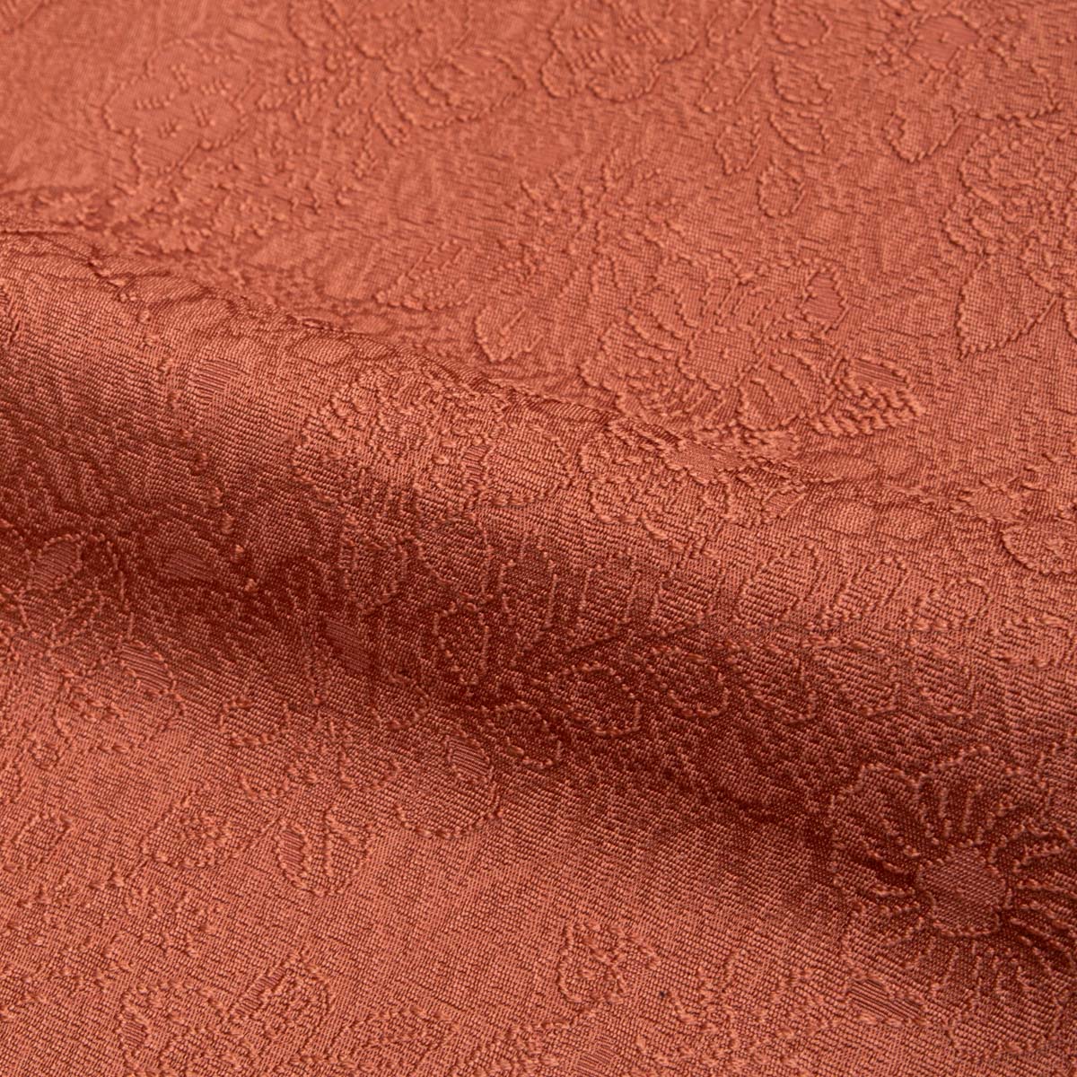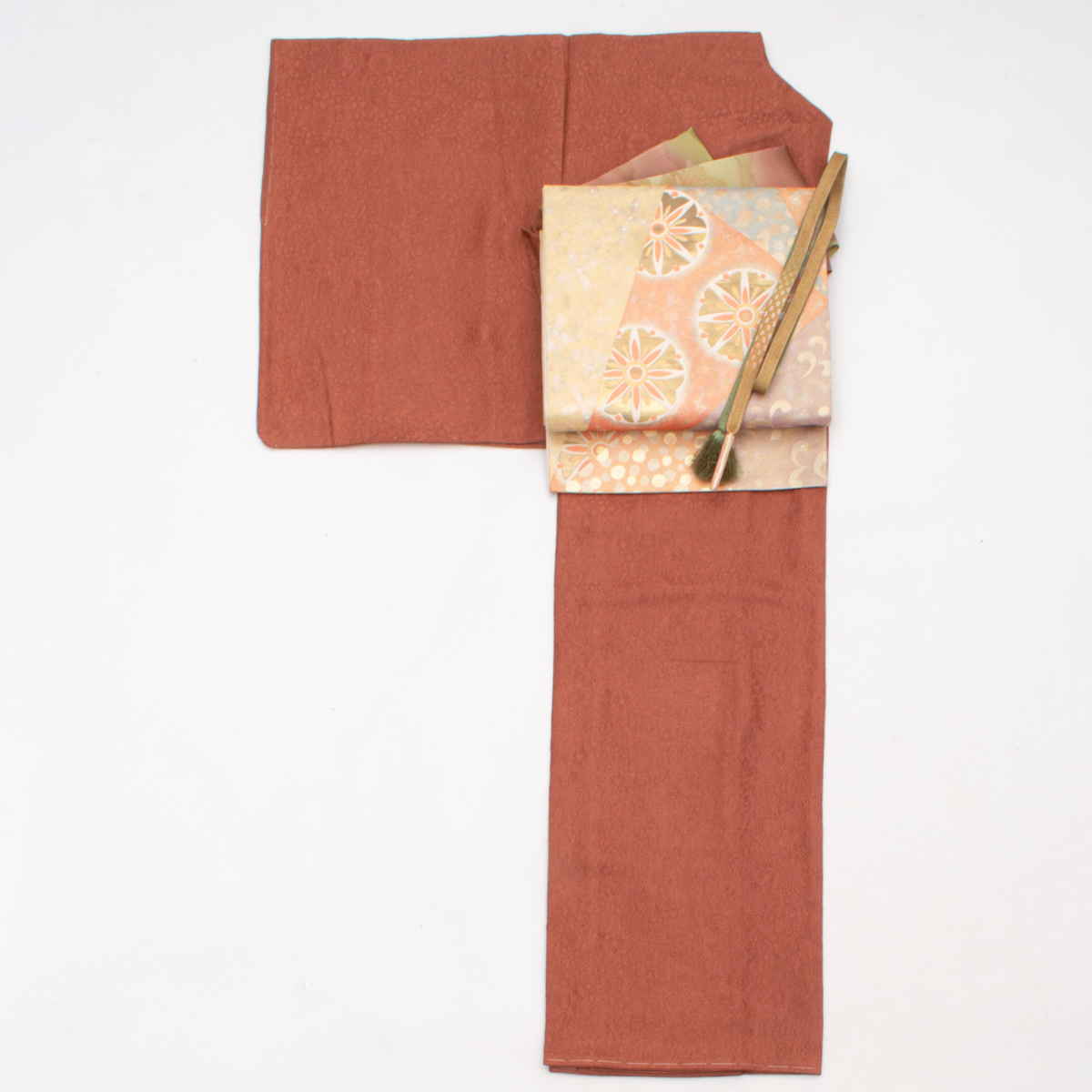 落ち着いた灰みの赤色が印象的な、紋なしの色無地です。