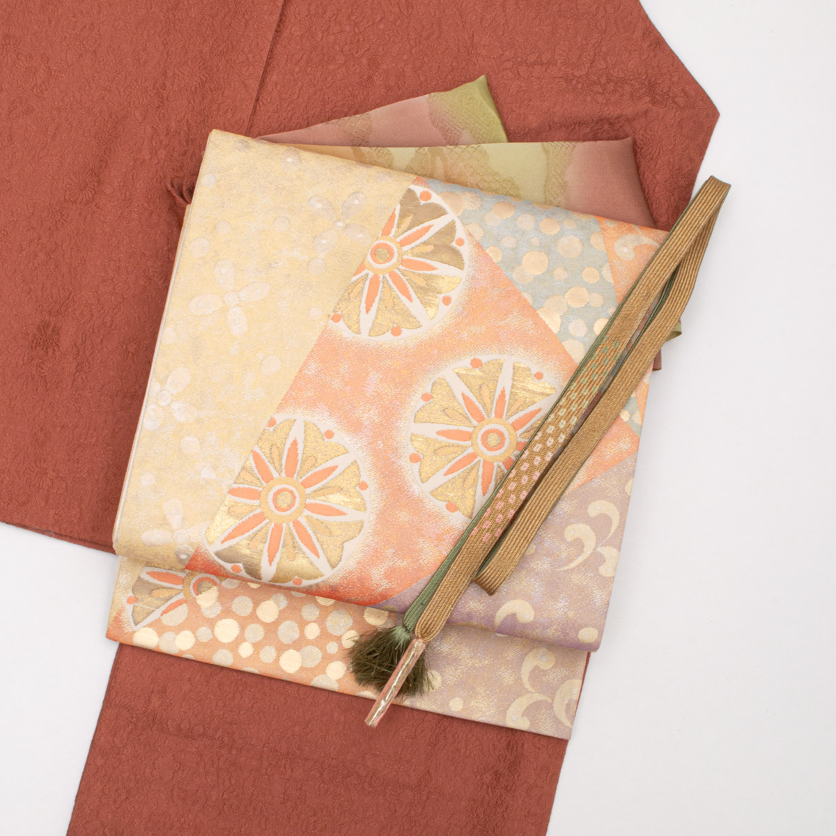■コメント色無地 紋なし 紋意匠 灰みの赤色と袋帯 切り嵌め調 丸文 抽象柄 淡いゴールド 金色 マルチカラーのコーディネートです。