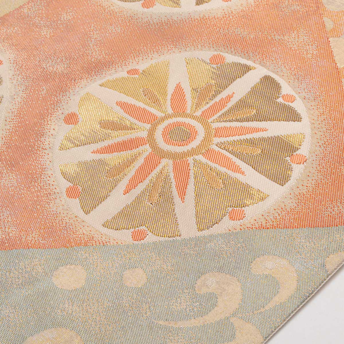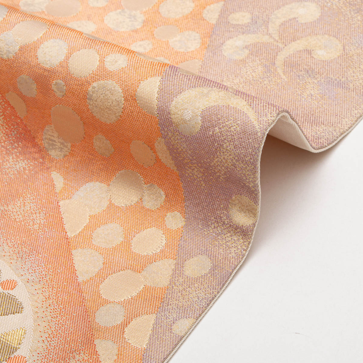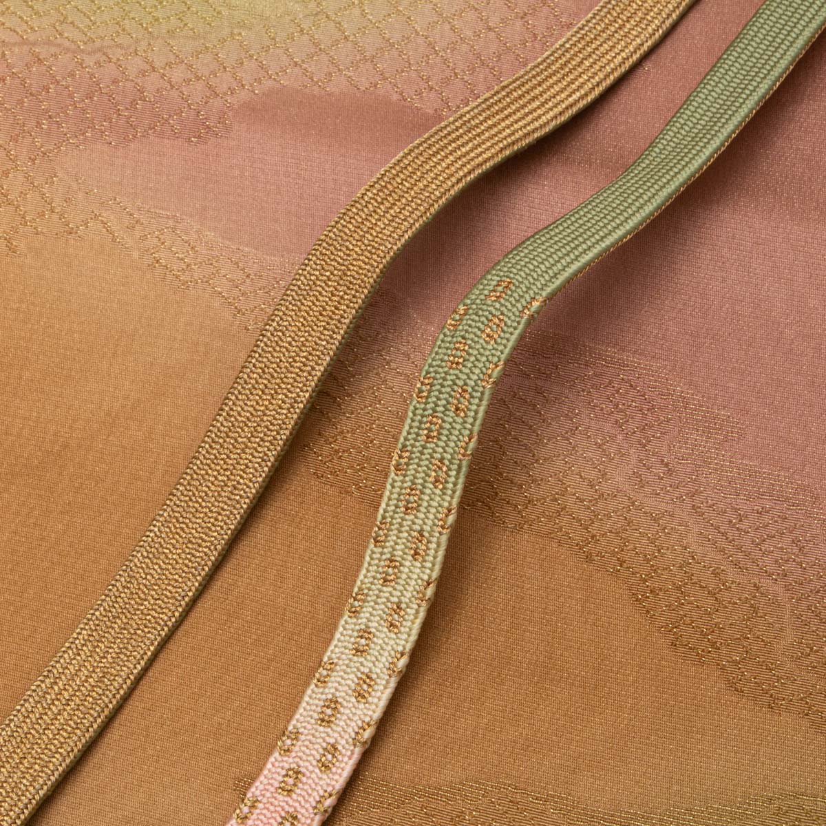 合わせた袋帯は、淡いゴールドを基調に金色とマルチカラーを織り交ぜたやわらかな輝きが魅力。