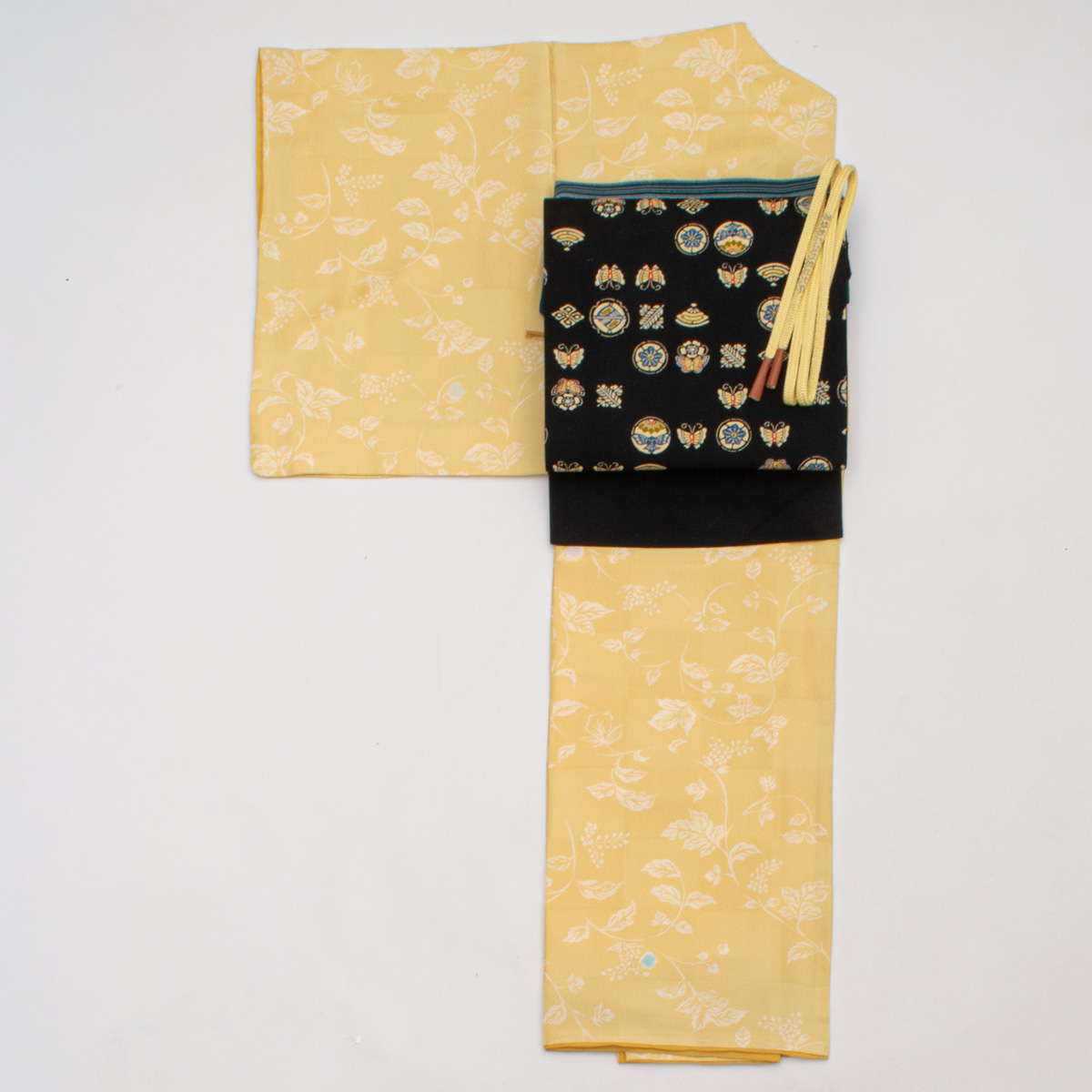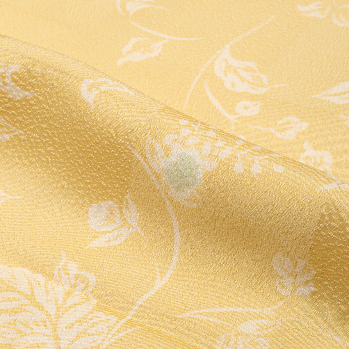 淡黄色の地に市松の地紋が浮かび上がり、花唐草文様がやさしく華やぐ小紋です。