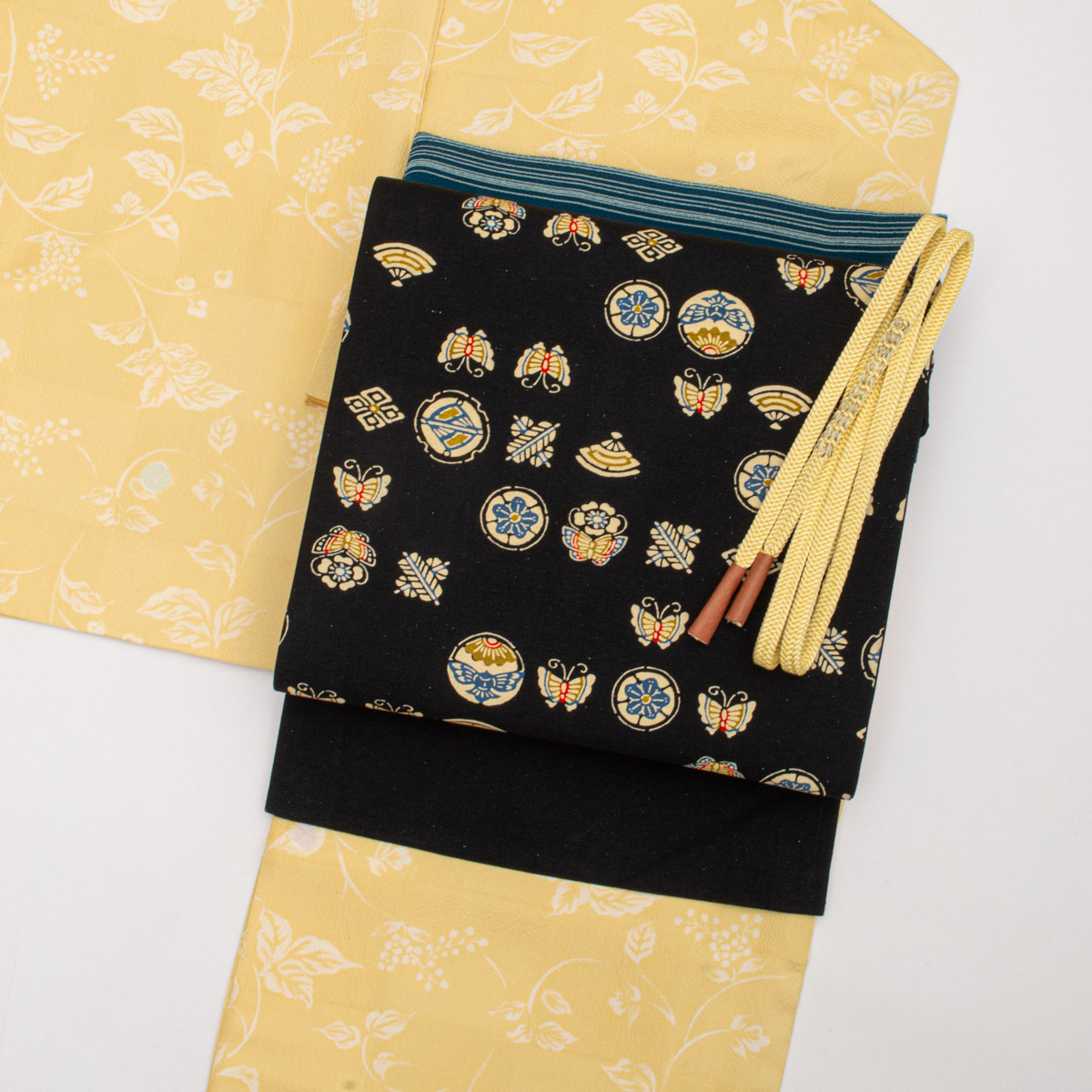 小紋 市松地紋 花唐草 淡黄色と名古屋帯 家紋散らし 型絵染め 紺色 九寸のコーディネートです。