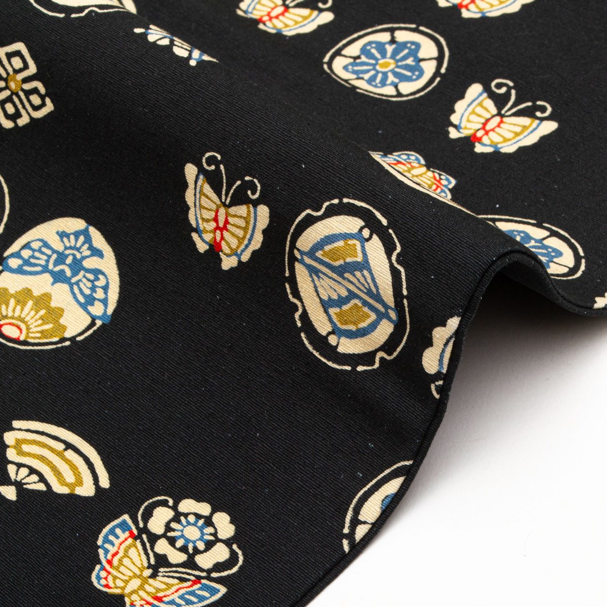 合わせた名古屋帯は、家紋を散らした型絵染めの意匠が印象的な一本です。