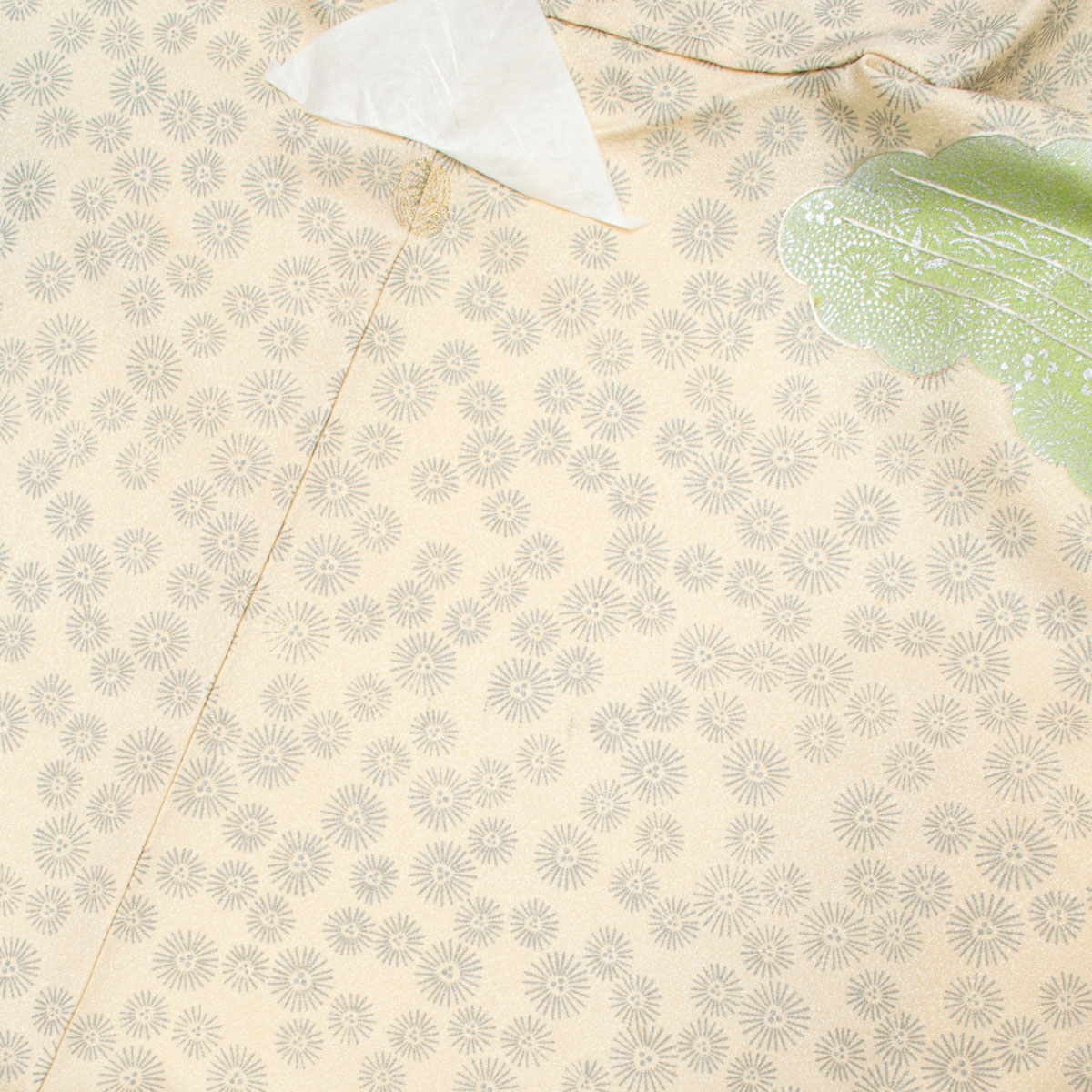 一つ紋 付け下げ小紋 銀彩 松 雲取り オフホワイト グリーン 正絹 着物 リサイクルのお品です。