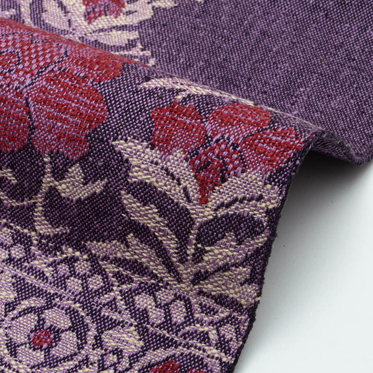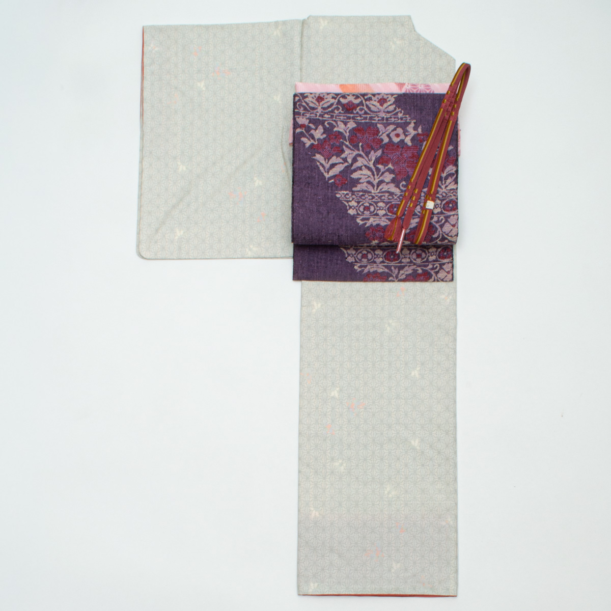 紫色の地に織り出された唐花草文様が、装いに奥行きと華やかさを加えます。