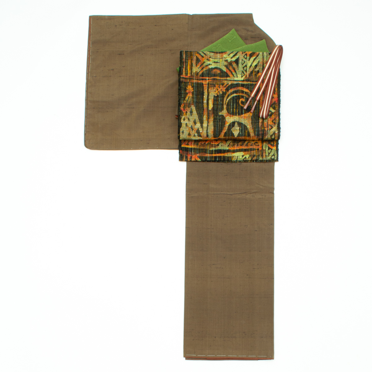【しつけ糸付き!コーディネート】紬 朽葉色と名古屋帯 異国調 抽象柄 橙 黒 深緑色 マルチカラー 八寸のコーデ 3