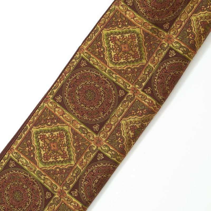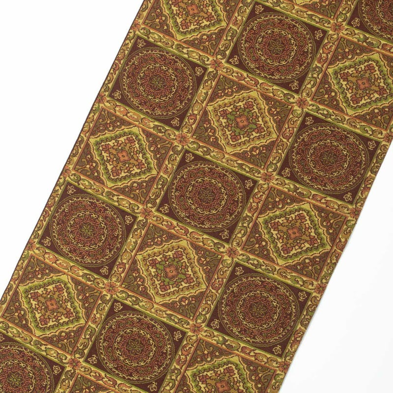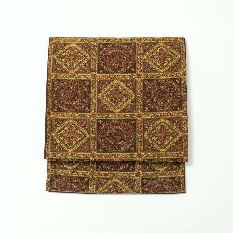 京袋帯 格子 唐花紋 ブラウンカラー 九寸 正絹のお品です。