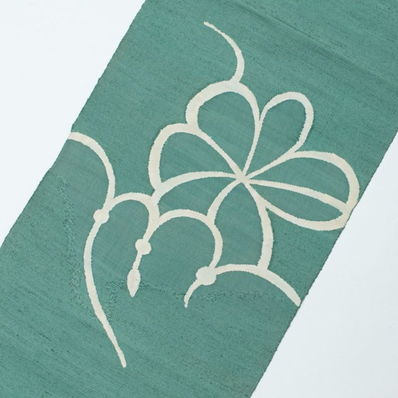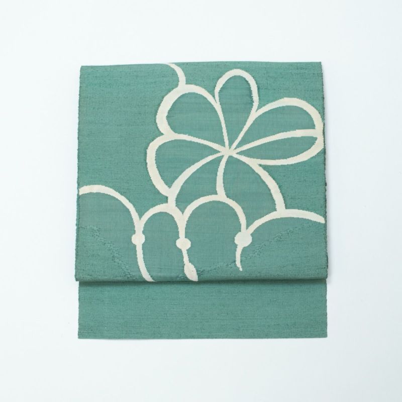 灰みを帯びた青緑色が、落ち着きの中に清涼感を漂わせるすくい織の八寸名古屋帯です。