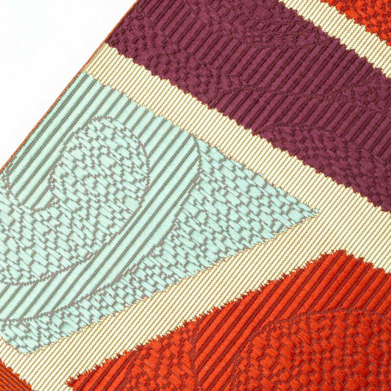 名古屋帯 博多 モダン 幾何学柄 赤 オレンジ 青磁 紫 薄黄色 九寸 正絹 のお品です。