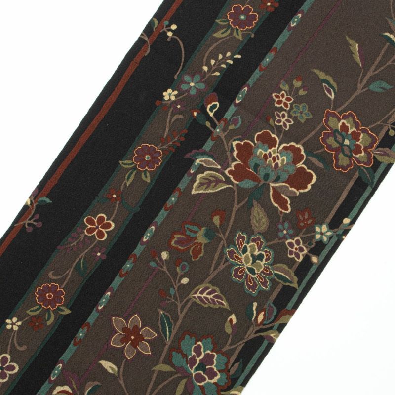 名古屋帯 縮緬 縞に花唐草文様 黒 赤 赤紫色 マルチカラー 九寸 正絹のお品です。