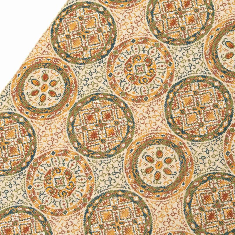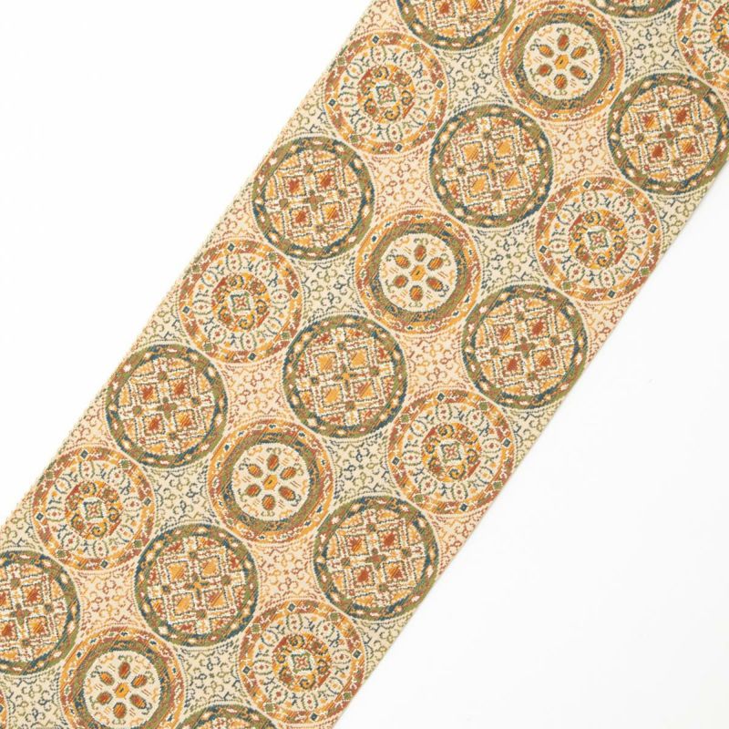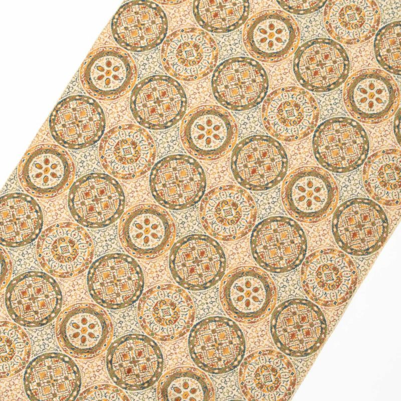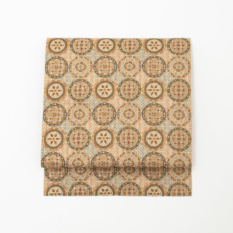 名古屋帯 唐花丸文繋ぎ 淡い灰みの黄色 マルチカラー 八寸 正絹のお品です。