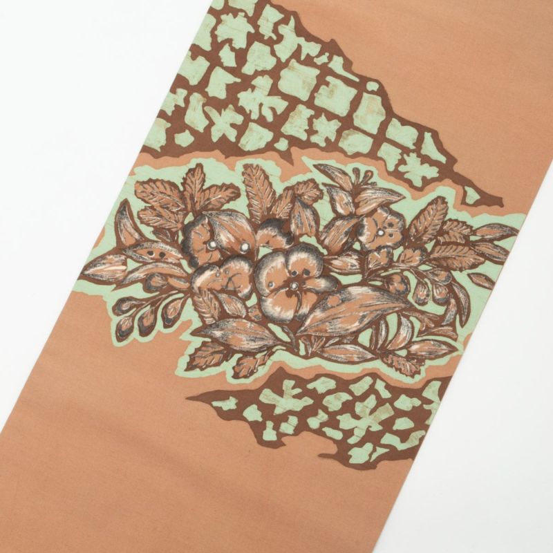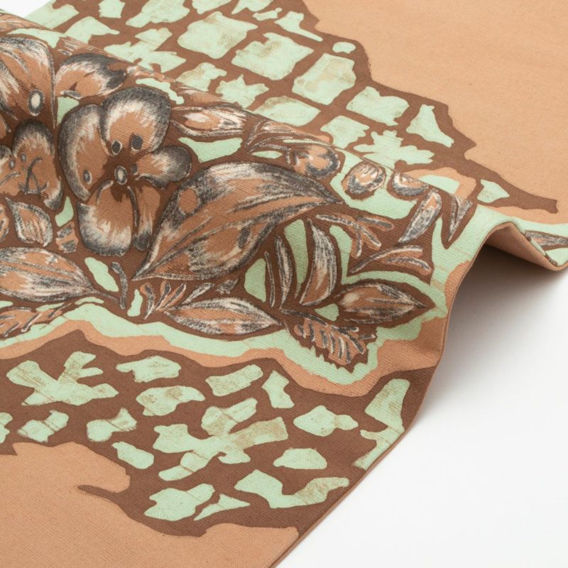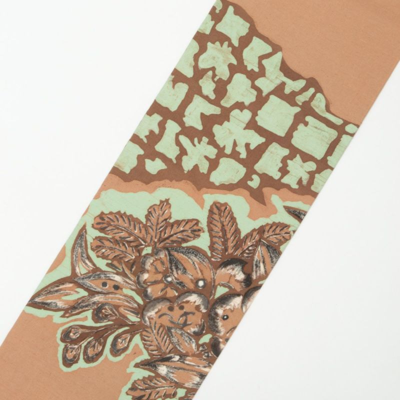 ろうけつ染ならではの柔らかな滲みが美しい、ボタニカル柄の名古屋帯です。