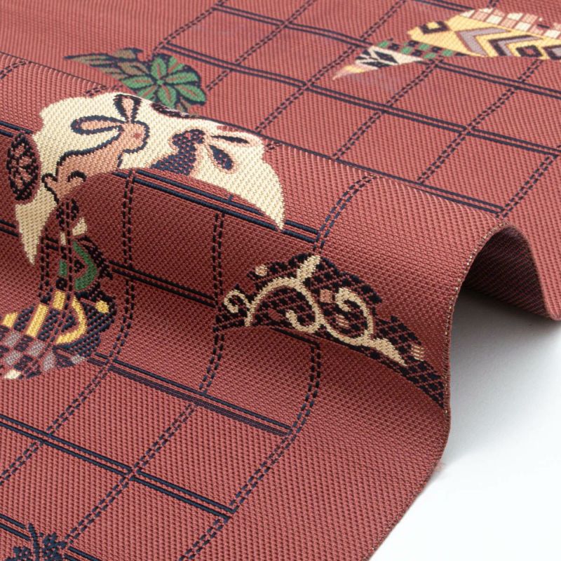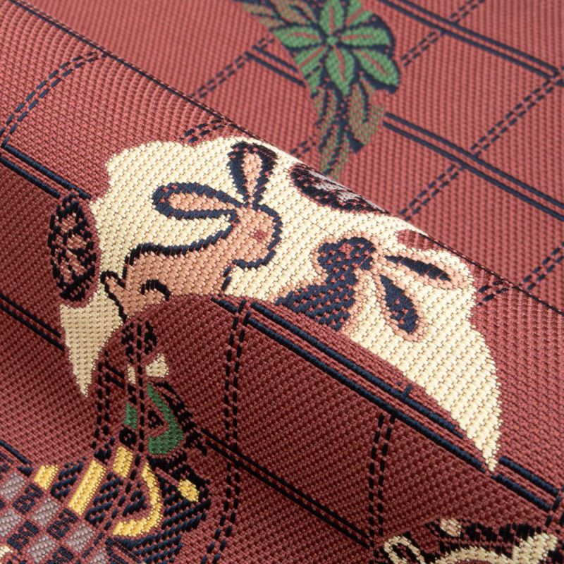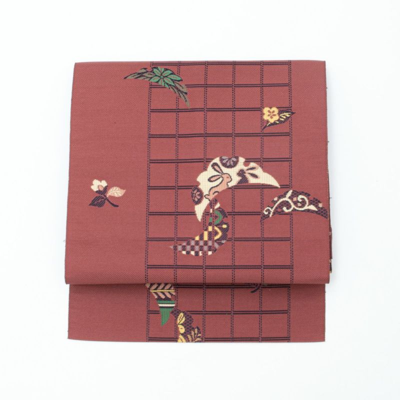 博多織ならではの張りと艶を持つ地に、愛らしい兎と雪輪芝文様が織り出された名古屋帯です。