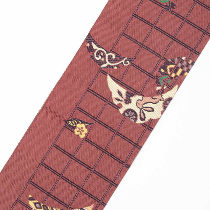 灰みの赤茶色の地色に、やわらかなマルチカラーの意匠が映え、上品な華やかさを感じさせます。