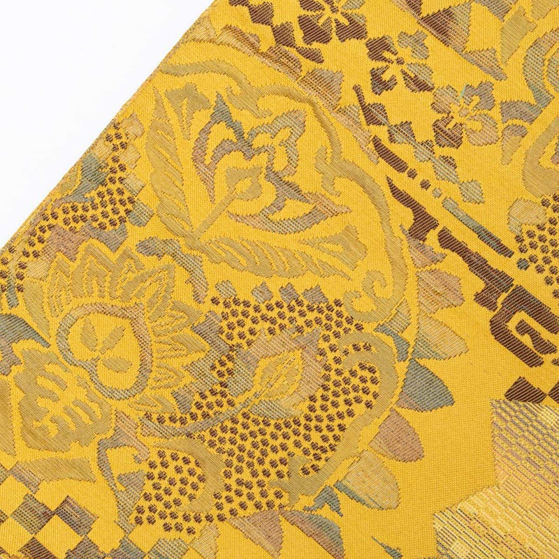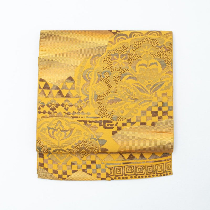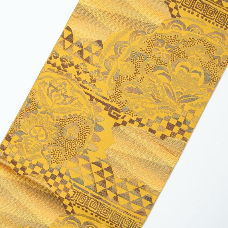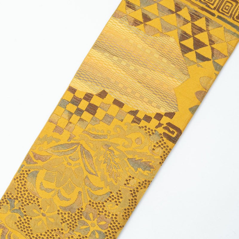 名古屋帯 抽象幾何学柄 黄土色 八寸 正絹のお品です。