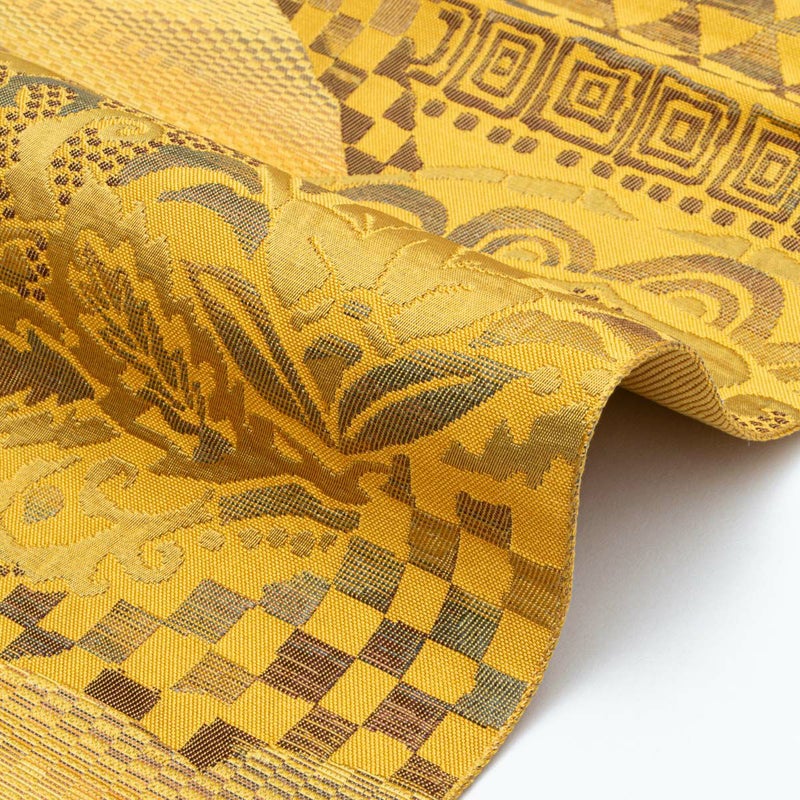 黄土色のやわらかな色調に、抽象的な幾何学柄を軽やかに配した名古屋帯です。