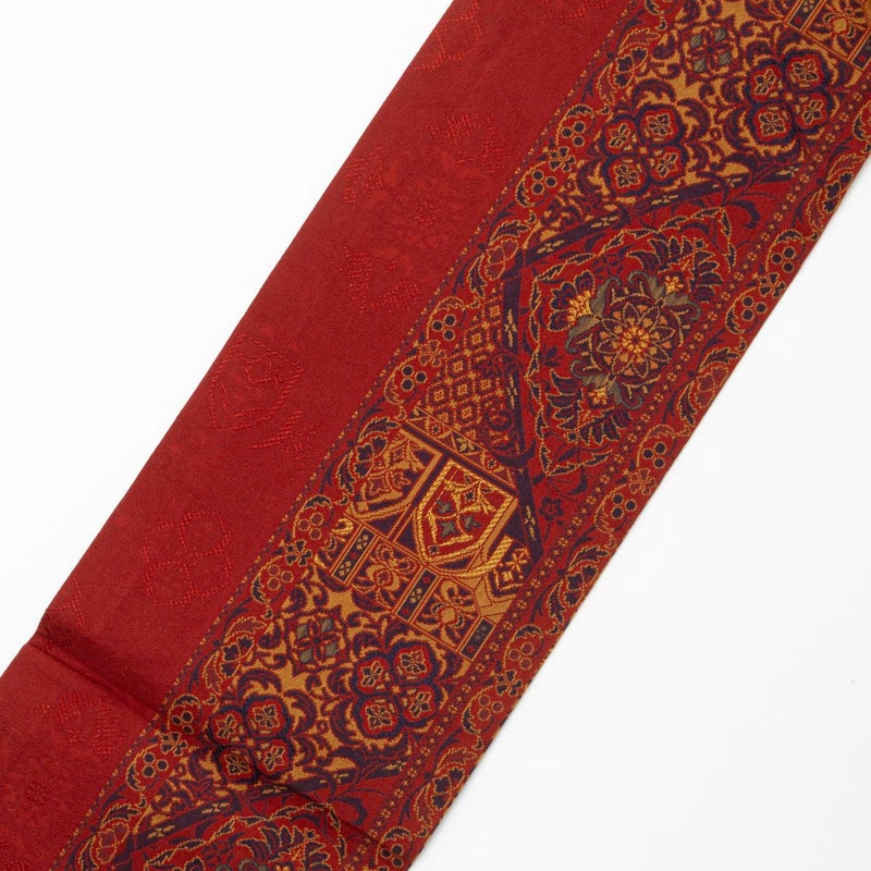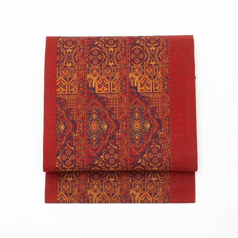 名古屋帯 オリエンタル文様 赤色 九寸 正絹のお品です。