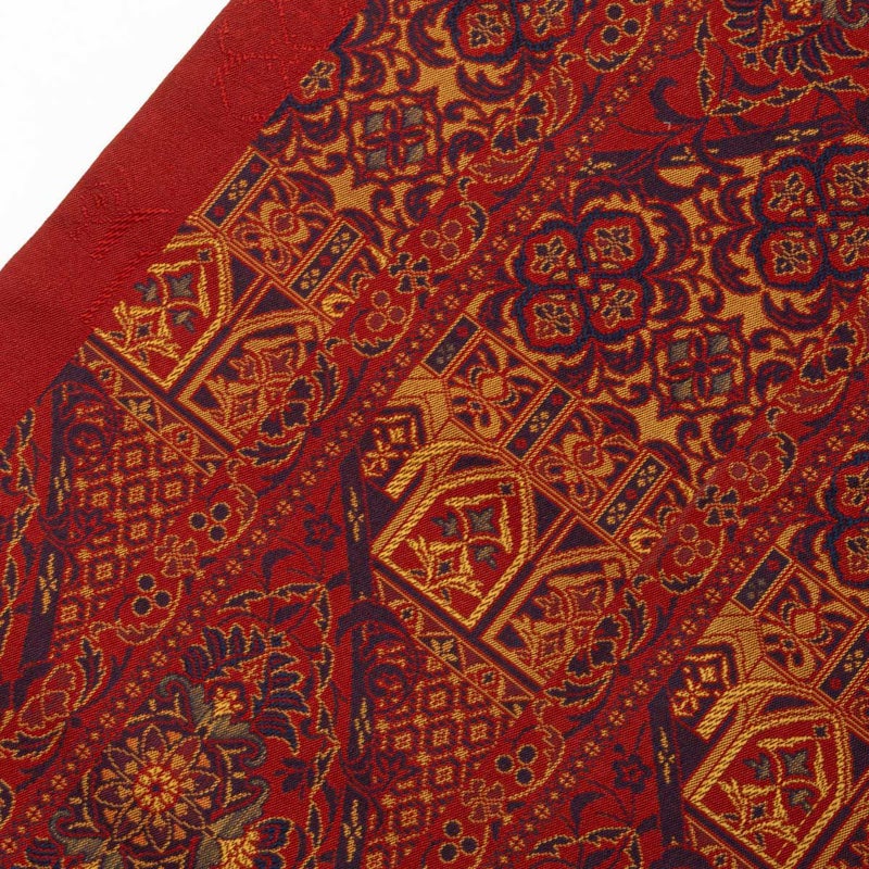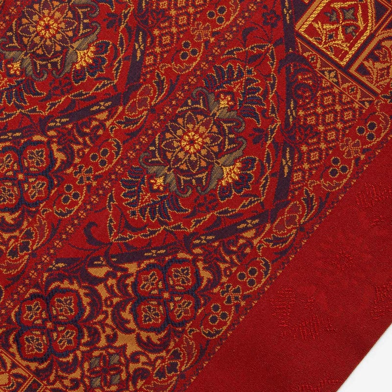 印象的な赤色の地に表情豊かな文様が映え、装いに華やかさと個性を添えます。