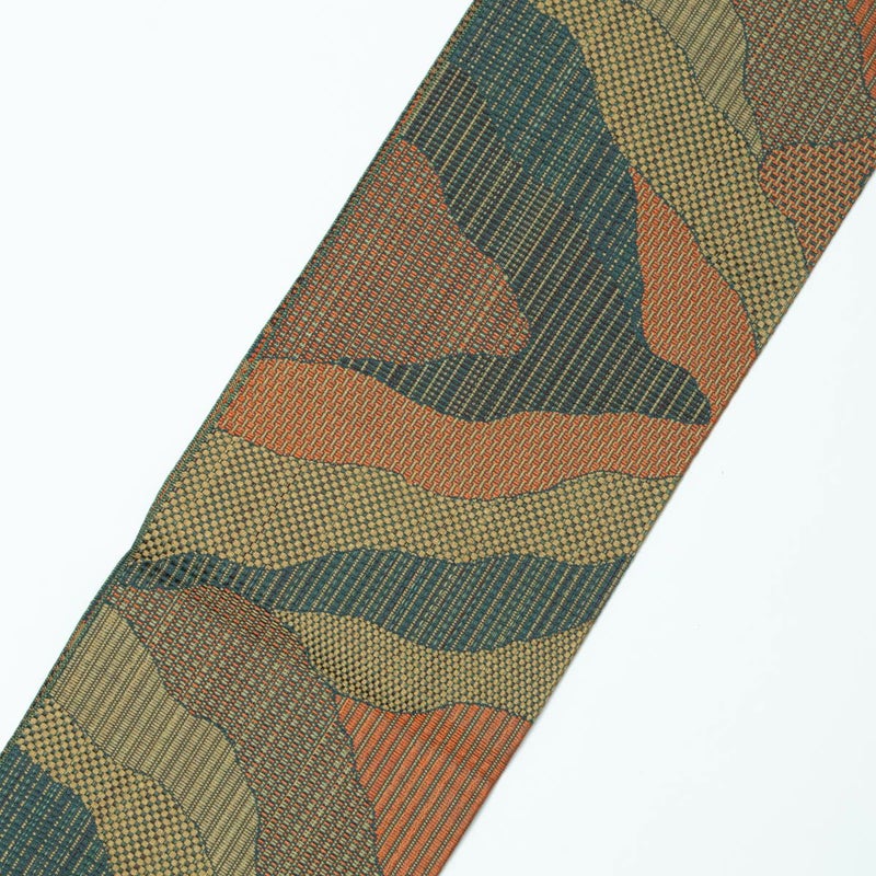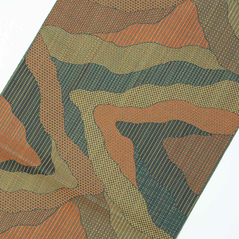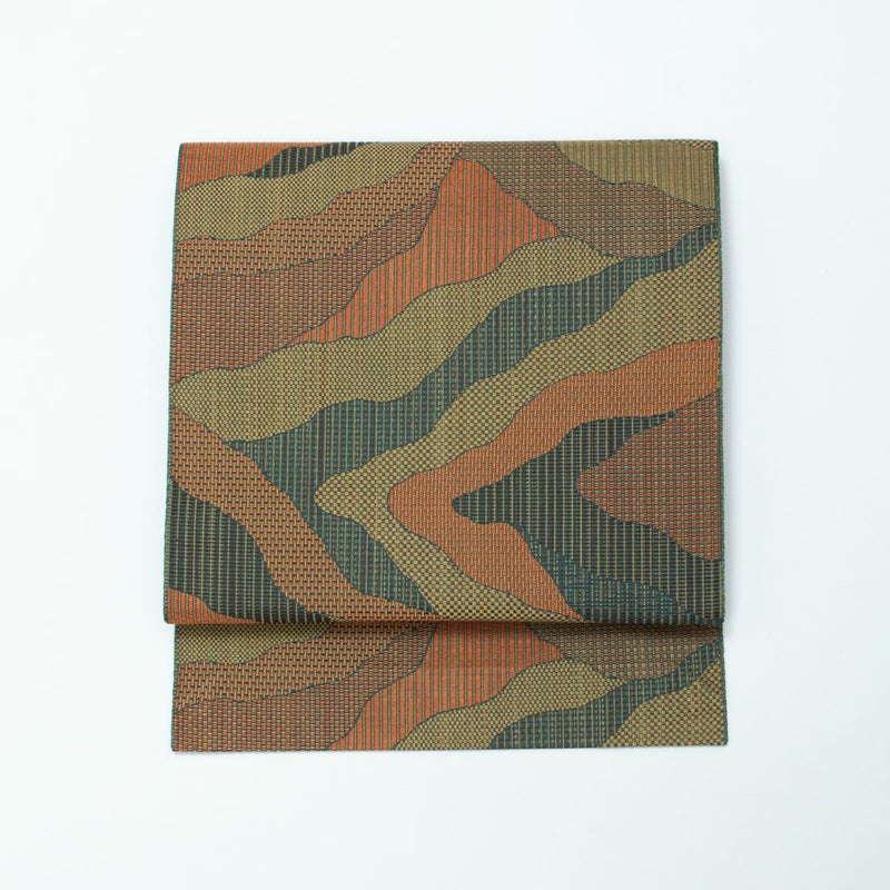 名古屋帯 博多 絵緯 紋織 灰みの緑 茶 黄緑色 八寸 正絹 のお品です。