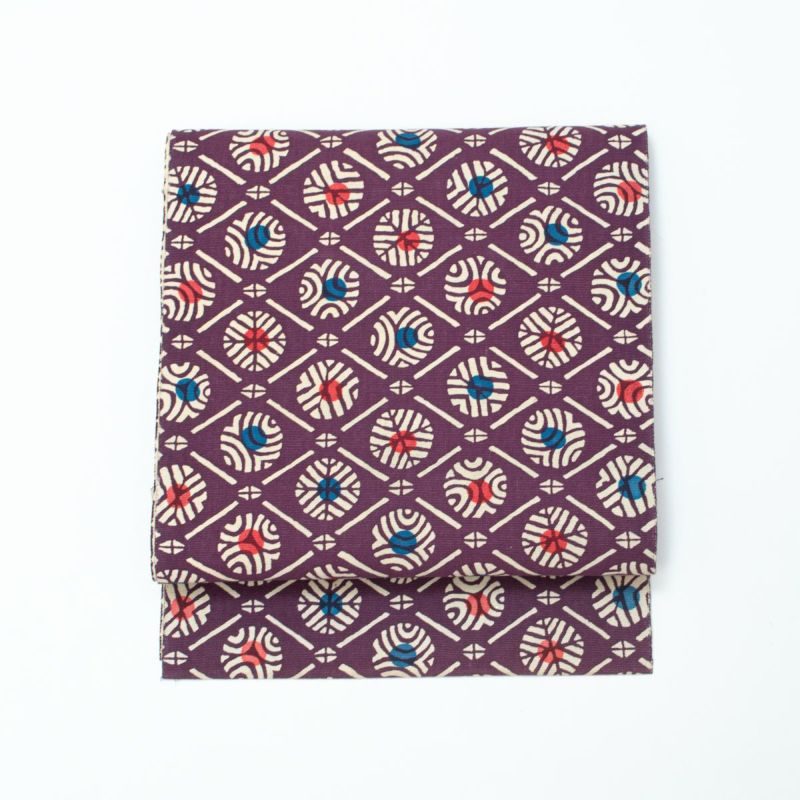 名古屋帯 型絵染め 草木染 幾何学柄 紫 青 赤色 八寸 正絹 のお品です。