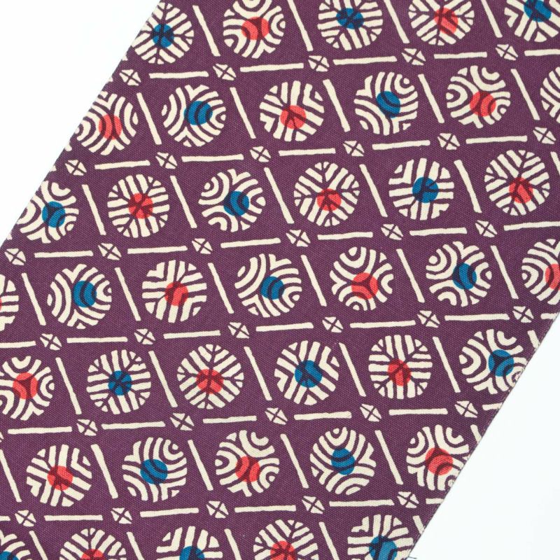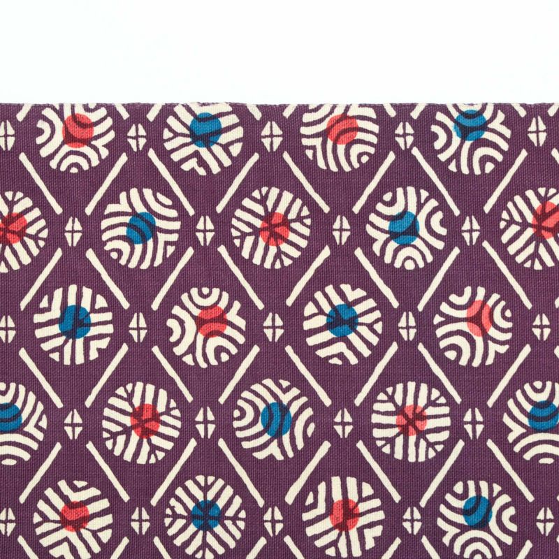 型絵染めで描かれた幾何学柄が、紫・青・赤の調和により上品かつモダンな印象を与えます。