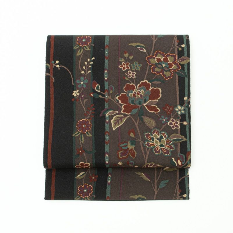 名古屋帯 縮緬 縞に花唐草文様 黒 赤 赤紫色 マルチカラー 九寸 正絹のお品です。