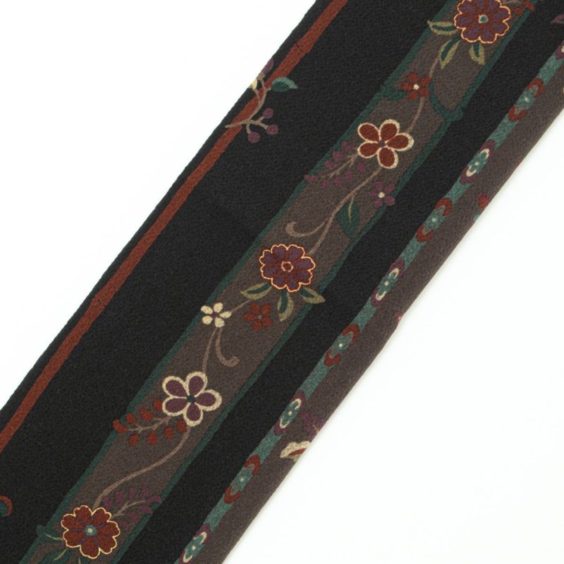 名古屋帯 縮緬 縞に花唐草文様 黒 赤 赤紫色 マルチカラー 九寸 正絹 リサイクル 18