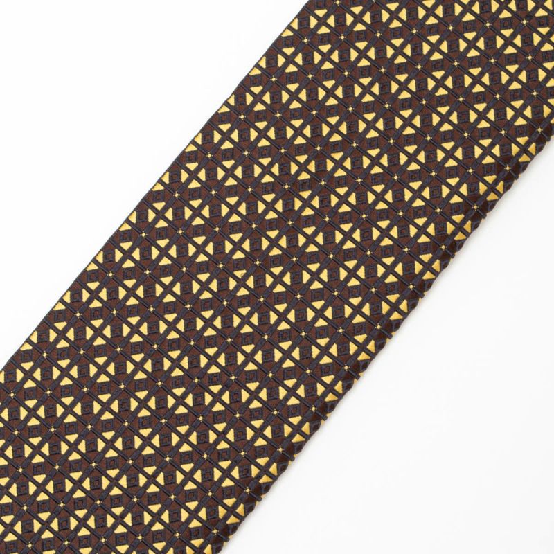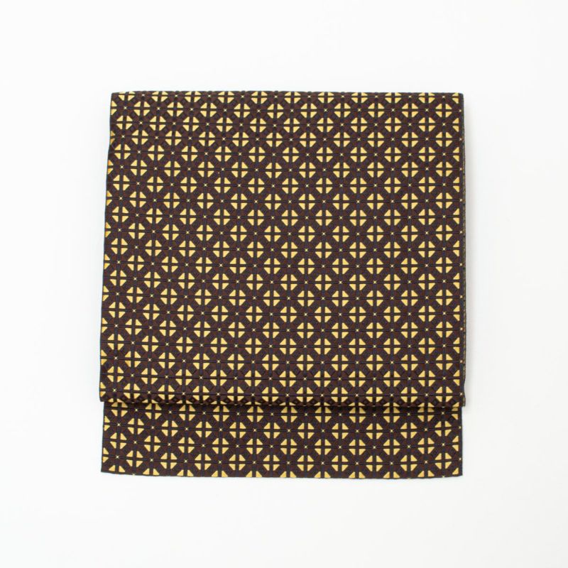 名古屋帯 博多 幾何学柄 黒 茶 黄色 八寸 正絹のお品です。