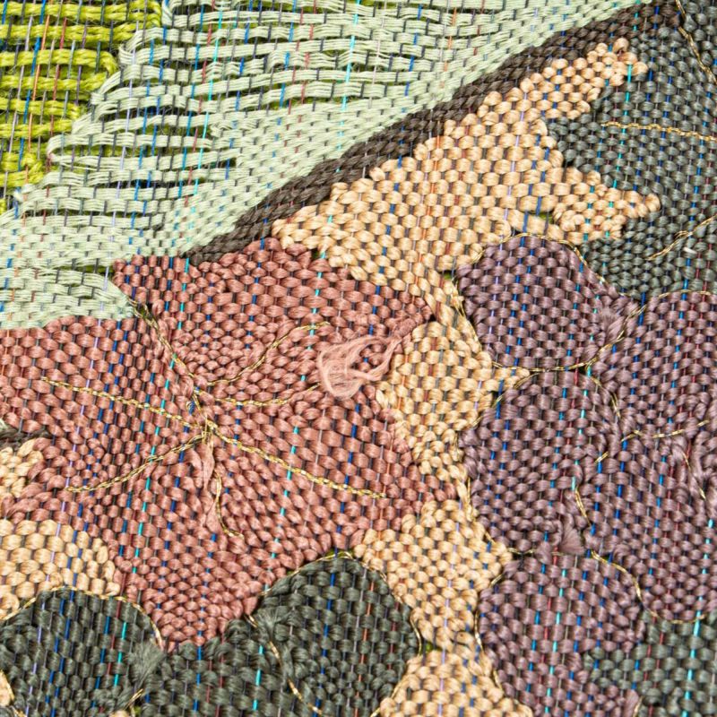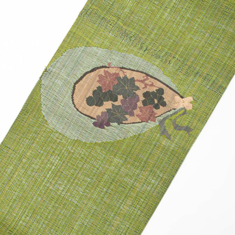 愛らしい葡萄をモチーフに、黄緑・緑・紫・水色の爽やかな色合いで織り上げた洒落袋帯です。