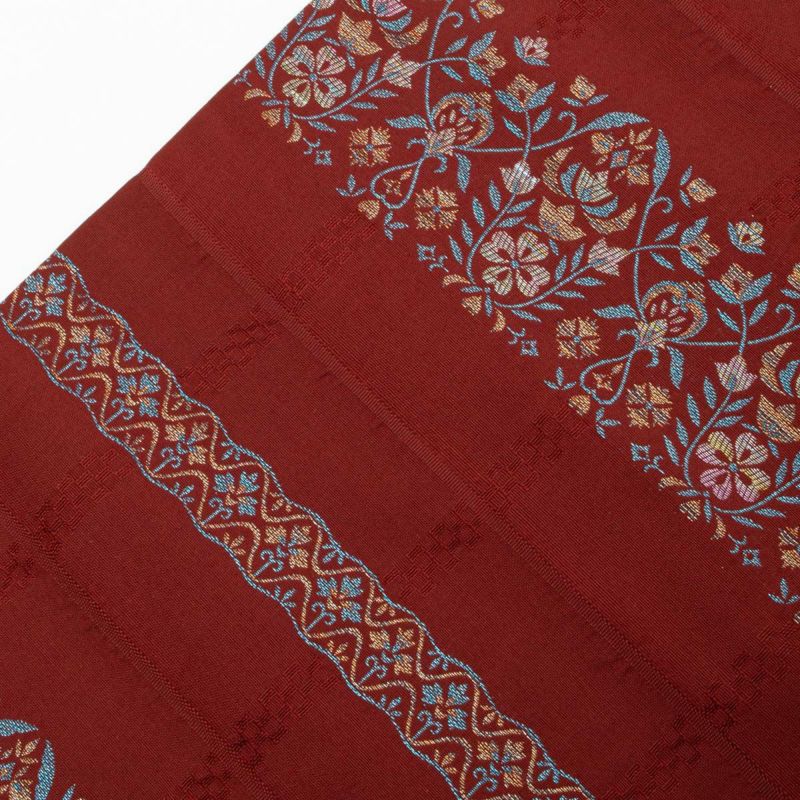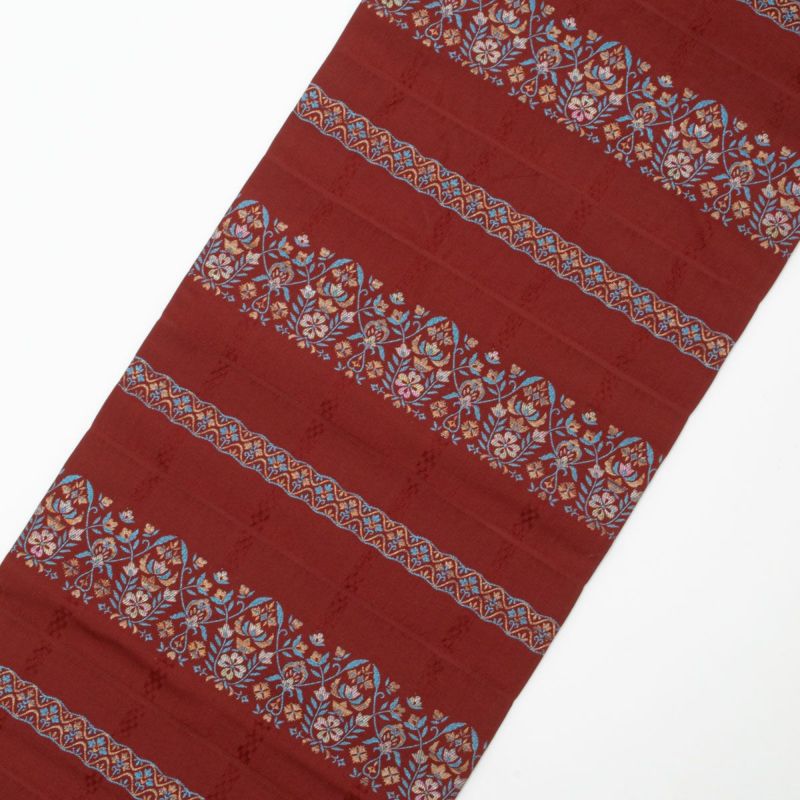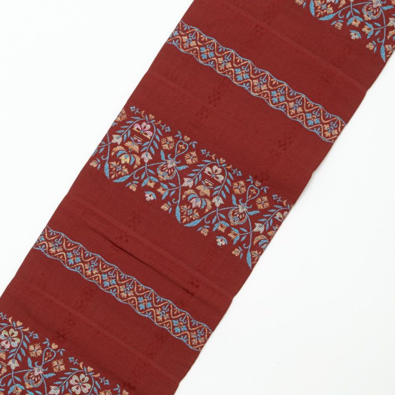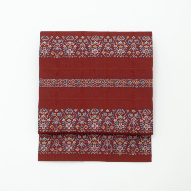 深みのある臙脂色を基調に、縞とボタニカル柄を組み合わせた九寸名古屋帯です。