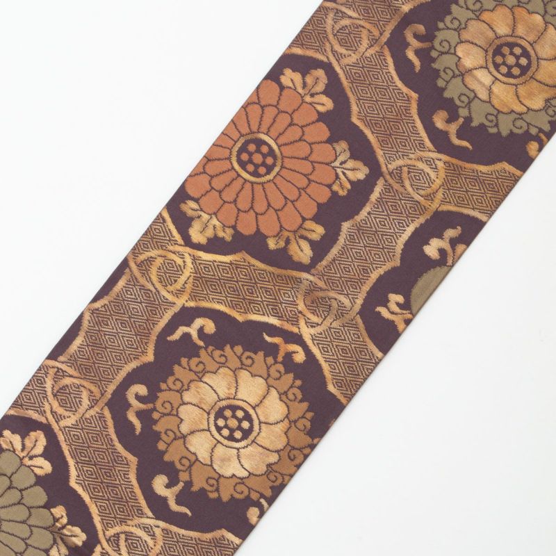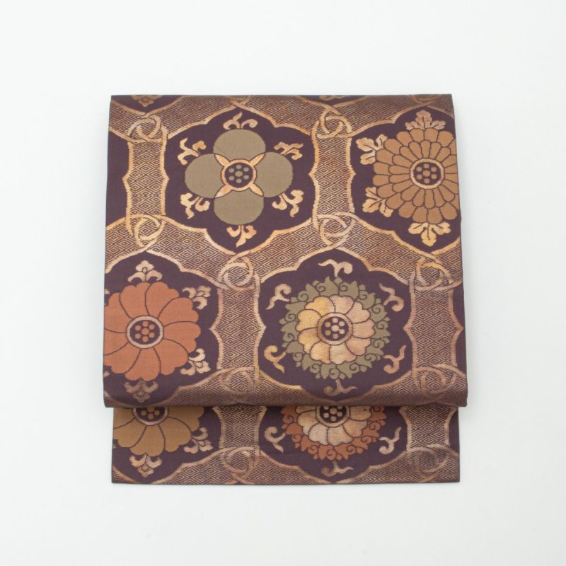 西陣織ならではの精緻な織りで表された亀甲唐花文繋が美しい九寸名古屋帯です。