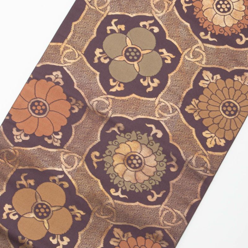 名古屋帯 西陣織 亀甲唐花文繋 暗い赤紫 緑 赤色 九寸 正絹のお品です。