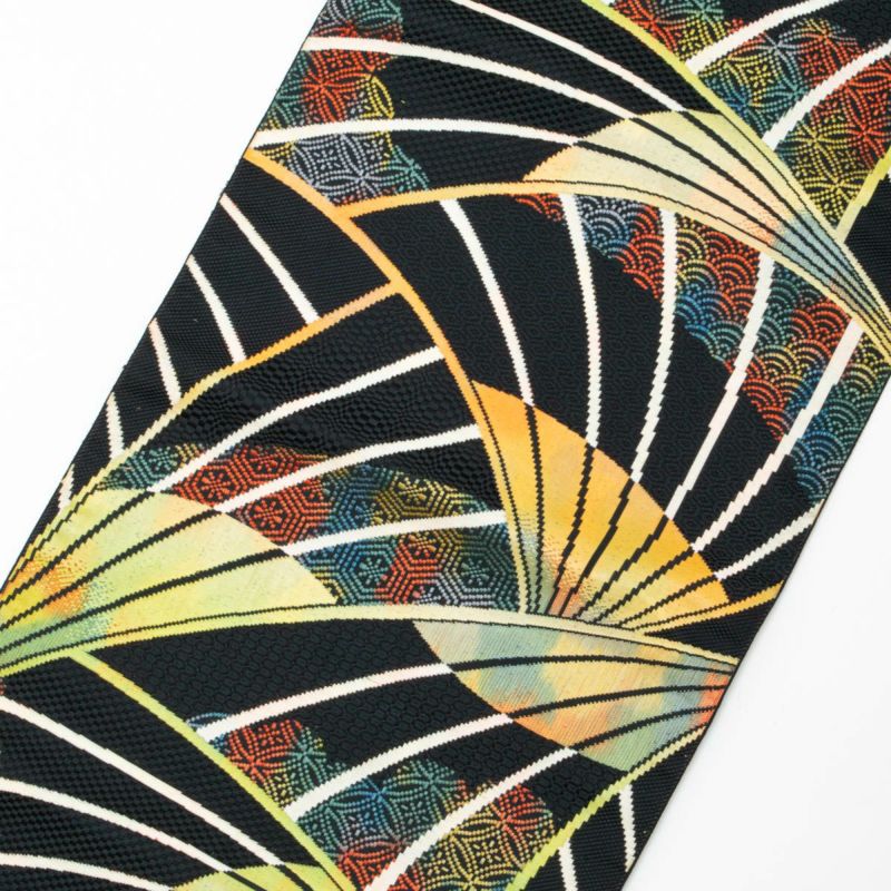 名古屋帯 博多 有職文様 黒色 マルチカラー 八寸 正絹のお品です。