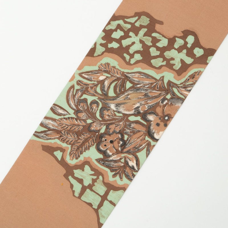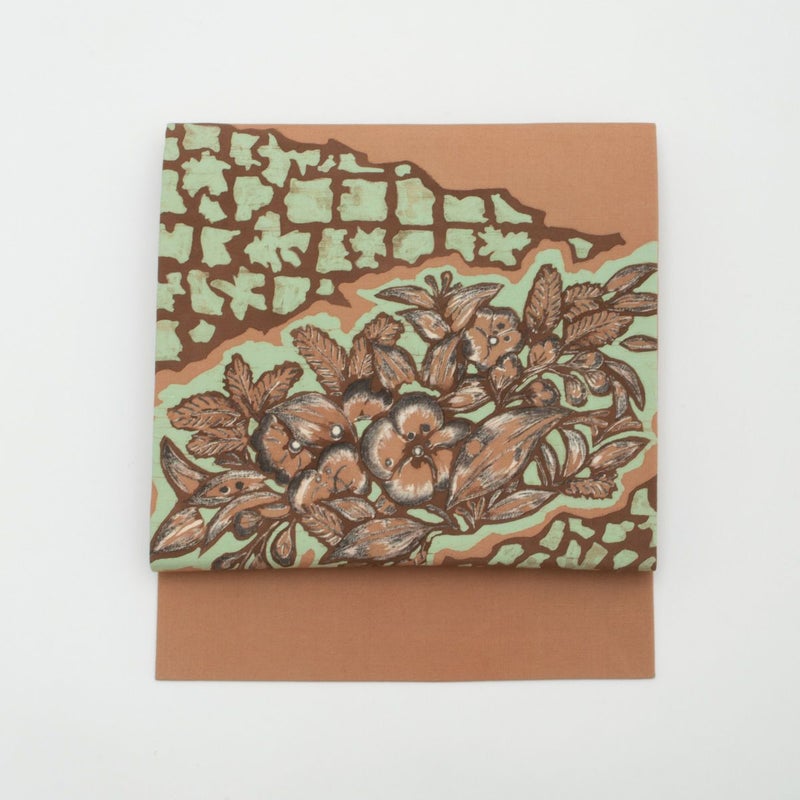 ろうけつ染ならではの柔らかな滲みが美しい、ボタニカル柄の名古屋帯です。
