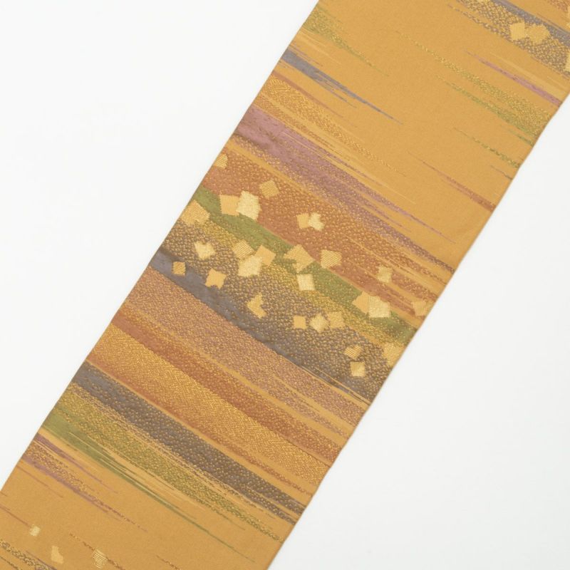 黄唐茶色を基調に、金糸を用いた煌めきがアクセントとなり、舞い散る紙吹雪のように軽やかで祝祭感あふれる表情を見せてくれます。