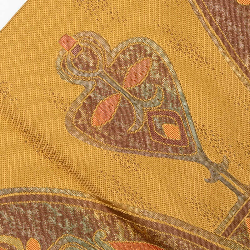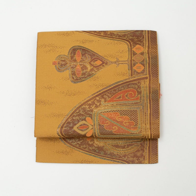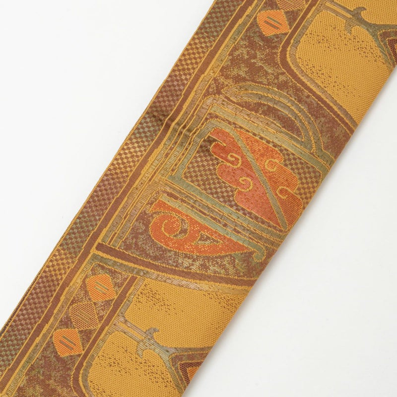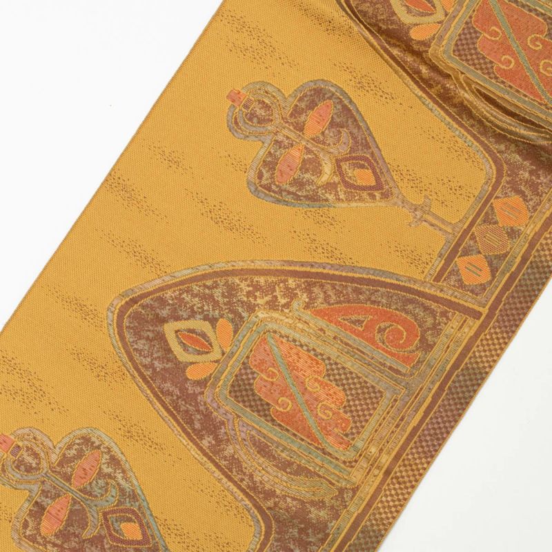 茶色と灰みの黄色を基調にした抽象柄の博多織の名古屋帯です。