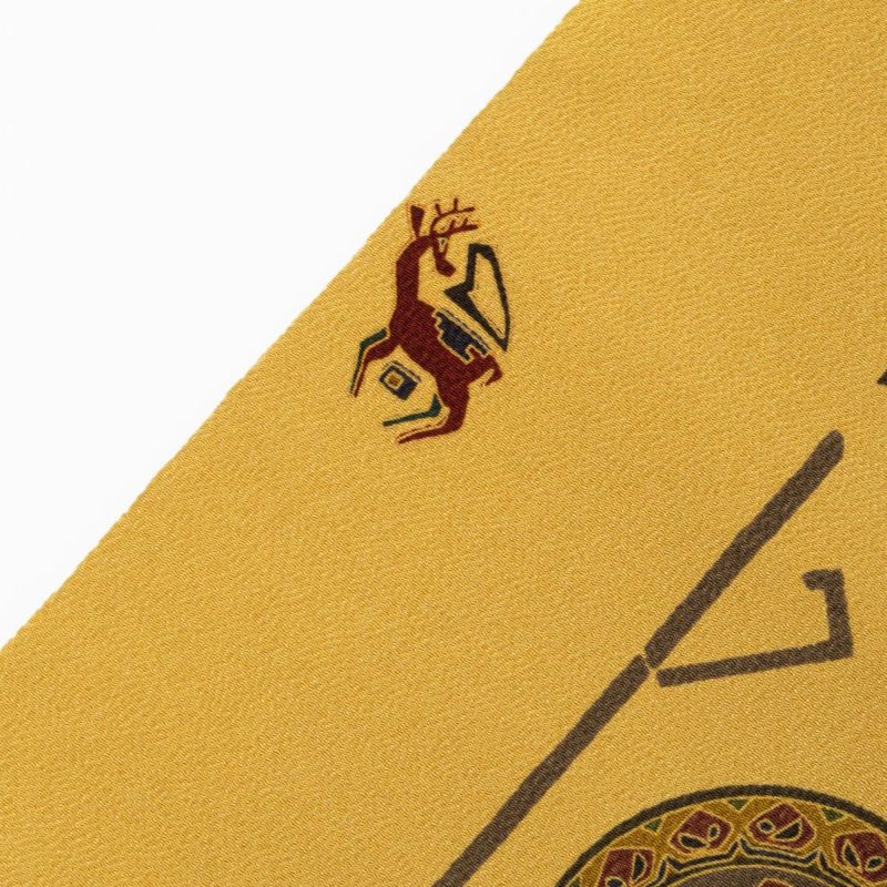 辛子色を基調に、マルチカラーで彩られた意匠が華やかさを添えます。