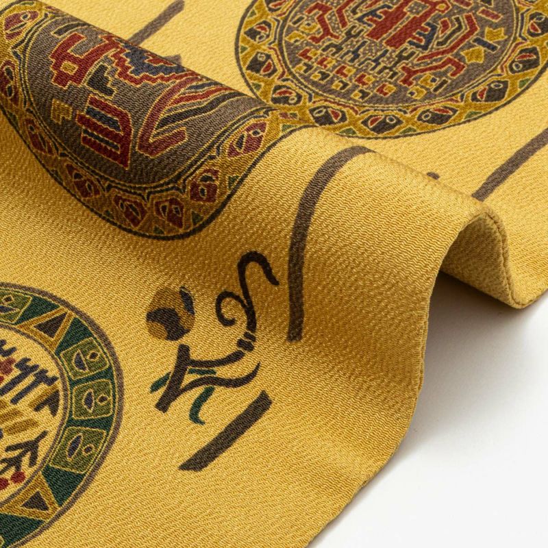 名古屋帯 縮緬 吉祥文様 丸紋 辛子色 マルチカラー 九寸 正絹 リサイクル 25