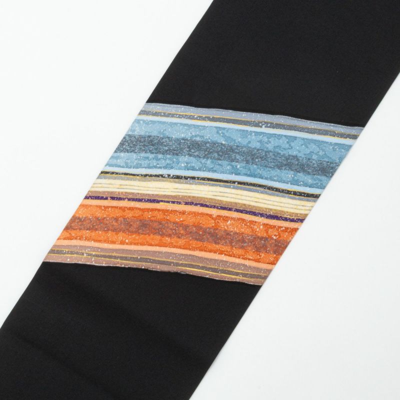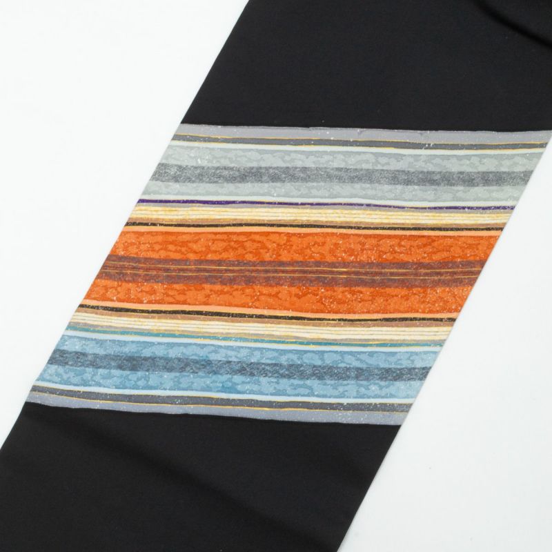 名古屋帯 塩瀬 スタイリッシュな斜め線 黒色 マルチカラー 九寸 正絹のお品です。