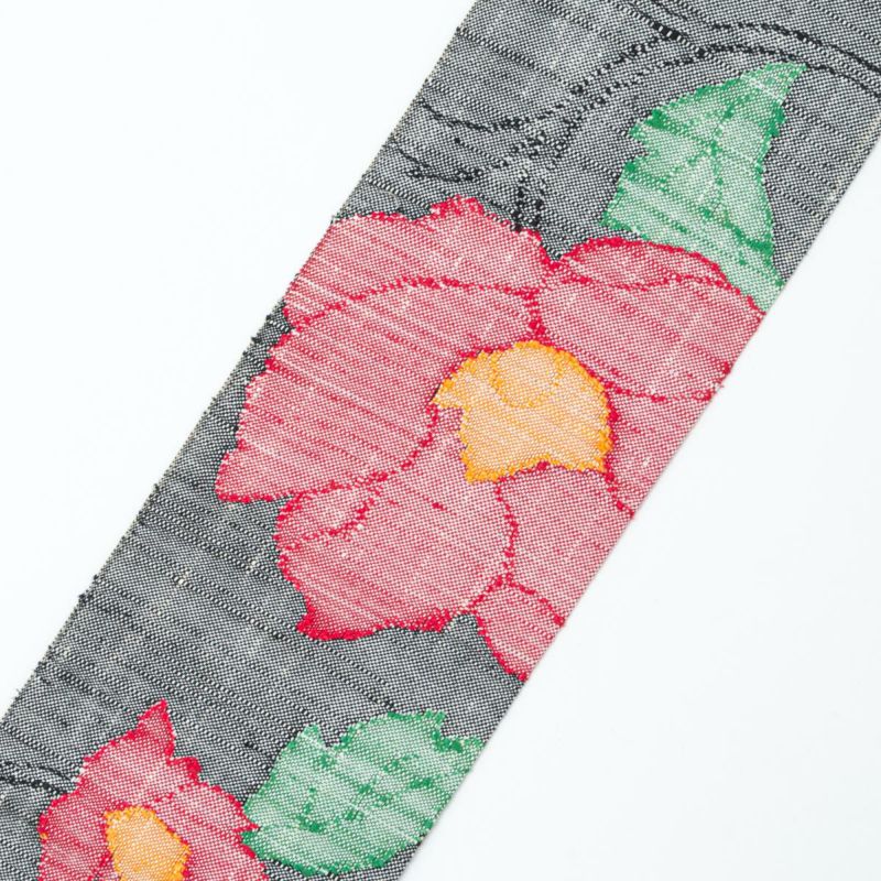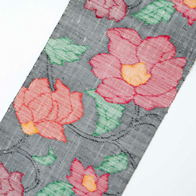 真綿ならではのぬくもりある風合いに、大胆な花柄が映える名古屋帯です。