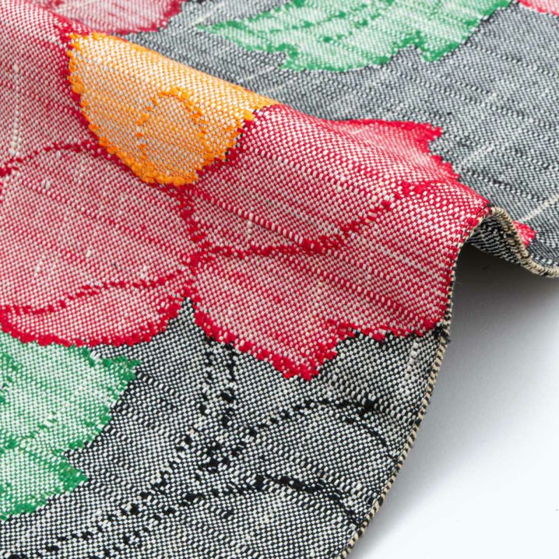 グレーをベースに赤や緑、橙色が華やかに調和し、装いに明るさと個性を添えます。