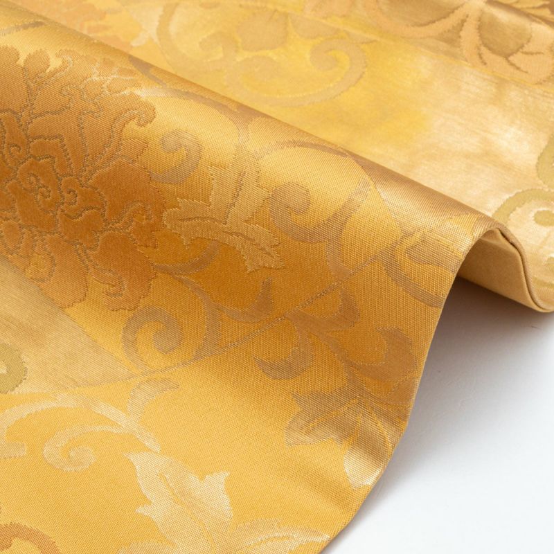 名古屋帯 引箔 牡丹唐草 黄 橙 金色 正絹のお品です。