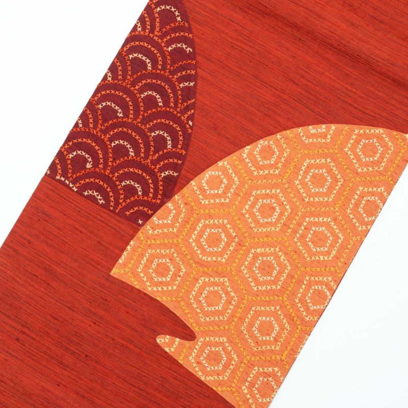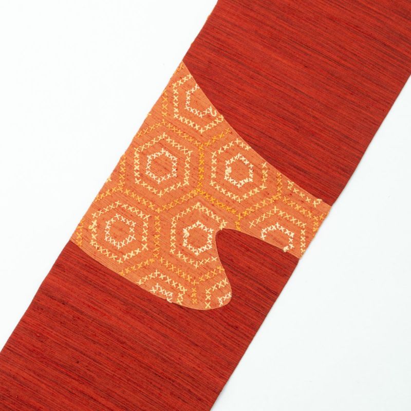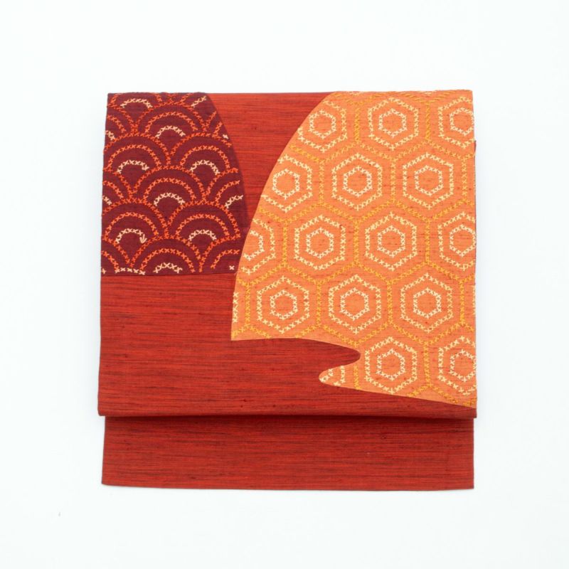 名古屋帯 切り嵌め 青海波 亀甲 刺し子 煉瓦色 九寸 正絹のお品です。