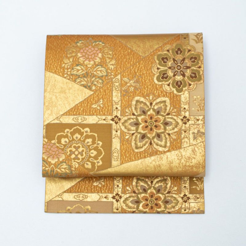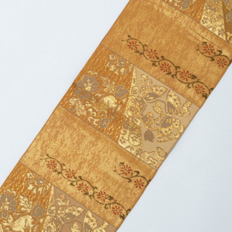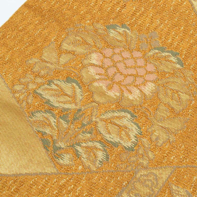 金色の地に唐花文と鶏頭文が格調高く織り出された名古屋帯です。