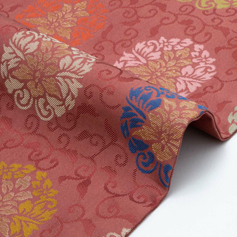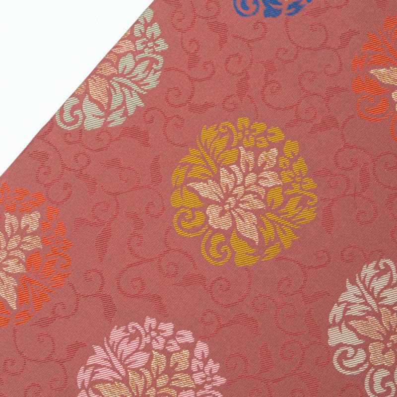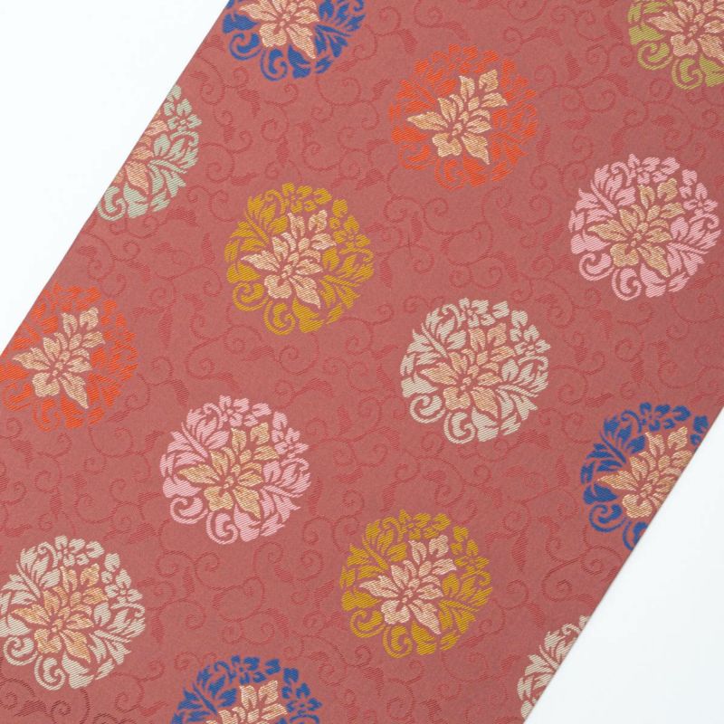 深みのある赤紫色地に、優雅な唐花丸紋があしらわれた名古屋帯です。